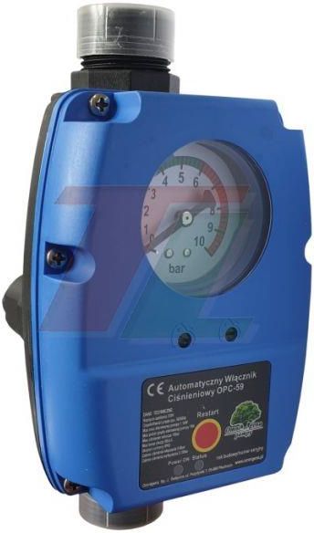 OMNIGENA Włącznik elektroniczny, OPC59 Charakterystyka produktu: OPC-59 jest urządzeniem elektronicznym, który służy do sterowania pracą pompy do wody sterując jej pracą na dwa sposoby. MODE 1- sterownik włącza i wyłącza pompę w zakresie nastawionych ciśnień. Zakres ciśnień nastawiamy poprzez pokrętła znajdujace się w obudowie sterownika. Na manometrze ciśnienie załączania oznaczone jest kolorem zielonym, natomiast ciśnienie wyłącznia kolorem czerwonym. W opisanym trybie zalecana jest praca wraz ze zbiornikiem hydroforowym MODE 2 - urządzenie będzie włączało i wyłączało pracę pompy kontrolując przepływ wody przez sterownik. Po zakręceniu kranu sterownik automatycznie wyłączy pompę - po okresie około 8 sekund. Specyfikacja funkcji/konstrukcji: zasilanie - 230V maksymalna moc sterowanej pompy - 1,1 kW zakres ciśnienia włączania - 0 do 6 bar zakres ciśnienia wyłączania - 2 do 10 bar dopuszczalne ciśnienie robocze - do 10 bar maksymalna temperatura cieczy - 60 st.C stopień ochrony - IP65 średnica króców - 1"x1" Dane technicze: Zasilanie - 230V Zakres ciśnienia włączania - 0 do 6 bar Zakres ciśnienia wyłączania - 2 do 10 bar Maksymalne ciśnienie robocze - 10bar Maksymalna temperatura otoczenia - 60 st.C Stopień ochrony - IP65 Średnica króćców - 1"x1" Automat sterujący pracą pomp. Zastępuje osprzęt hydroforowy. Nr katalogowy: OPC59