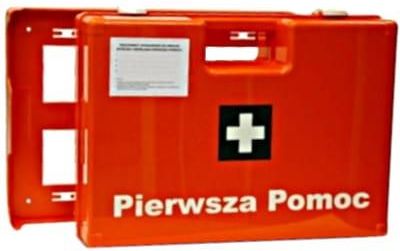 Wysokiej jakości przemysłowa apteczka w walizce z tworzywa - podwójne wyposażenie według europejskiej normy 1x DIN13164 + 1x DIN 13157 PLUS- idealna dla firm zatrudniających do 50 pracowników- uchwyt do zamocowania na ścianie- funkcjonalna, łatwa w przenoszeniu i otwieraniu Kolory apteczek: pomarańczowy PKWiU: 32.50.5 • Wymiary: 450 mm x 335 mm x 150 mm Wyposażenie apteczki: - plaster z opatrunkiem 6 x 10 cm (16 szt.)- plaster na szpulce 5 m x 2,5 cm (2 szt.)- zestaw plastrów (4 rodzaje) (20 szt./ 1 opak)- bandaż elastyczny 4m x 6 cm (4 szt.)- bandaż elastyczny 4 m x 8 cm (5 szt.)- rękawiczki jednorazowe winylowe (8 szt./ 4 pary)- chusta opatrunkowa 60 x 80 cm (2 szt)- chusta opatrunkowa 60 x 40 cm (2 szt)- bandaż z kompresem (opatrunek indywidualny) 6 x 8 cm (1 szt.)- bandaż z kompresem (opatrunek indywidualny) 8 x 10 cm (6 szt.)- bandaż z kompresem (opatrunek indywidualny) 10 x 12 cm (2 szt.)- kompres na rany (12 szt./6 opak)- kompres na oko 5 x 7,5 cm (2 szt.)- chusta trójkątna (4szt)- zimny kompres (1 szt.)- koc termiczny (ratunkowy) (2 szt.)- chusta z flizeliny 20 x 30 cm (5 szt./1 opak)- nożyczki (2 szt)- worek foliowy (2 szt.)- instrukcja „Pierwsza pomoc w nagłych wypadkach” + aparat do sztucznego oddychania.