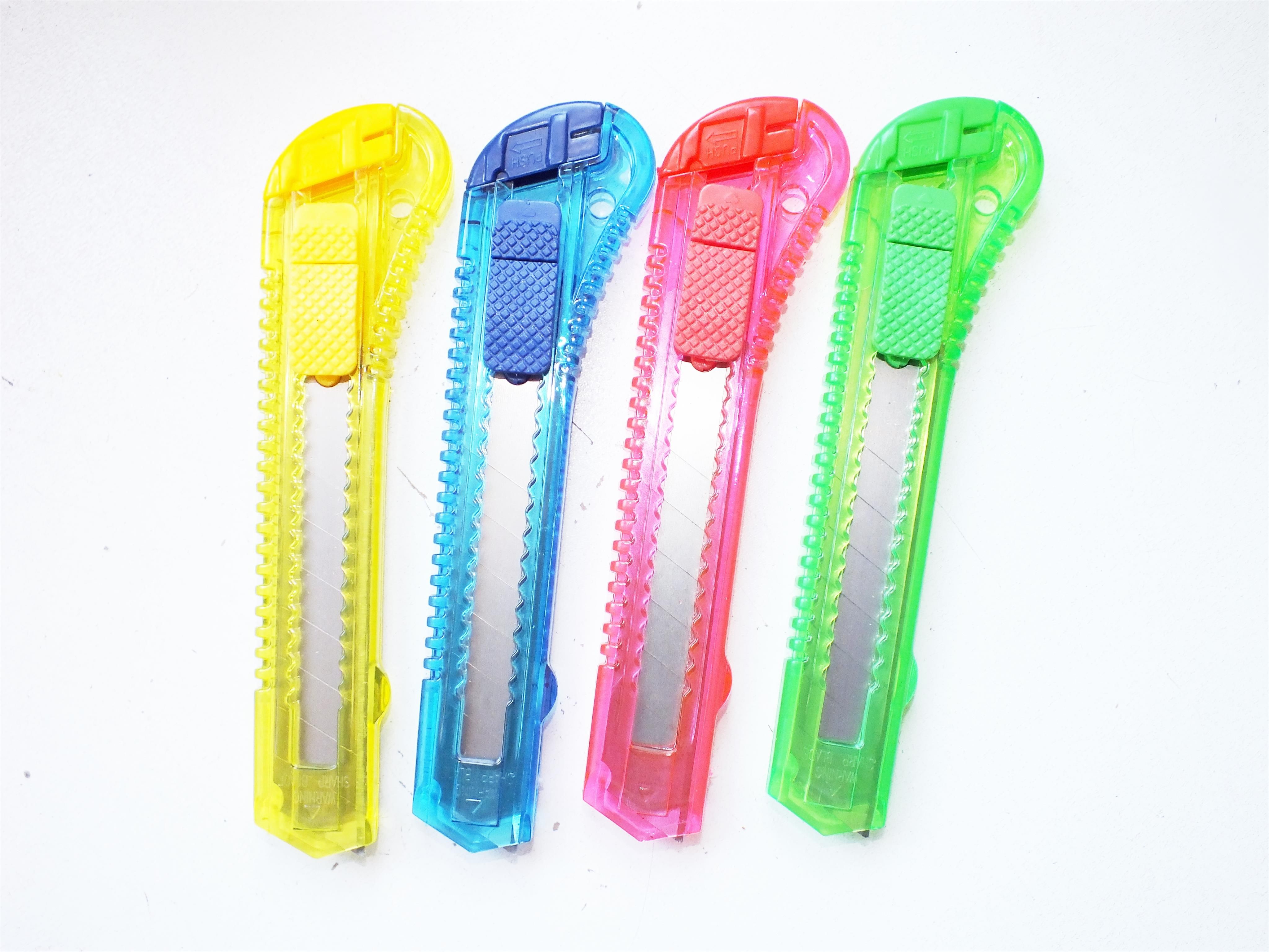 Nożyk do tapet 100x18x0.5mm Uniwersalny nożyk z ostrzem łamanym o długości 150 mm. Kompozytowy korpus gwarantujący optymalny czas użytkowania. Zapadkowy mechanizm wysuwania ostrza. Nożyk współpracuje z ostrzami w rozmiarze 18 mm. Wymiana ostrza następuje po wysunięciu dolnego elementu. Nożyk wyposażony w specjalny łamacz do segmentów ostrzy. W każdym z nożyku znajduje się jedna sztuka ostrza. Nożyki występują w 4 kolorach - wysyłamy je losowo. DANE TECHNICZNE: Typ: Nożyk z ostrzem łamanym Rozmiar ostrza [mm]: 18 Długość całkowita [mm]: 160