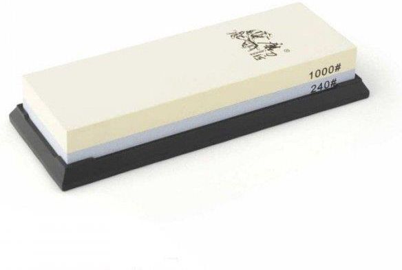 Doskonała ostrzałka do noży dla ludzi którzy chcą mieć pełną kontrolę nad ostrzeniem noża. Jedna strona ostrzałki o gradacji 240 naostrzy zgrubnie nawet najbardziej tępy nóż. Druga o gradacji 1000 pozwala na perfekcyjne wykończenie każdego ostrza. Dane techniczne: Typ ostrzałki - ręczna Materiał ścierny - korund Gradacja 240/1000 Ostrzałka ma certyfikat SGS gdzie badano min. grubość ziaren. Przeznaczenie: Noże stalowe Tasaki Dłuta Nożyczki Instrukcja użycia: Namocz kamień w wodzie lub użyj oleju do ostrzałek firmy Taidea. Postaw ostrzałkę na płaskiej powierzchni. By naostrzyć nóż, przesuń po kamieniu (lekko dociskając) kilkukrotnie najpierw jedną, potem drugą stronę noża. Ostrząc nóż staraj się zachować odpowiedni kąt pochylenia noża (15°-30°) Do utrzymania prawidłowego kąta ostrzenia polecamy użycie prowadnicy T1091AC