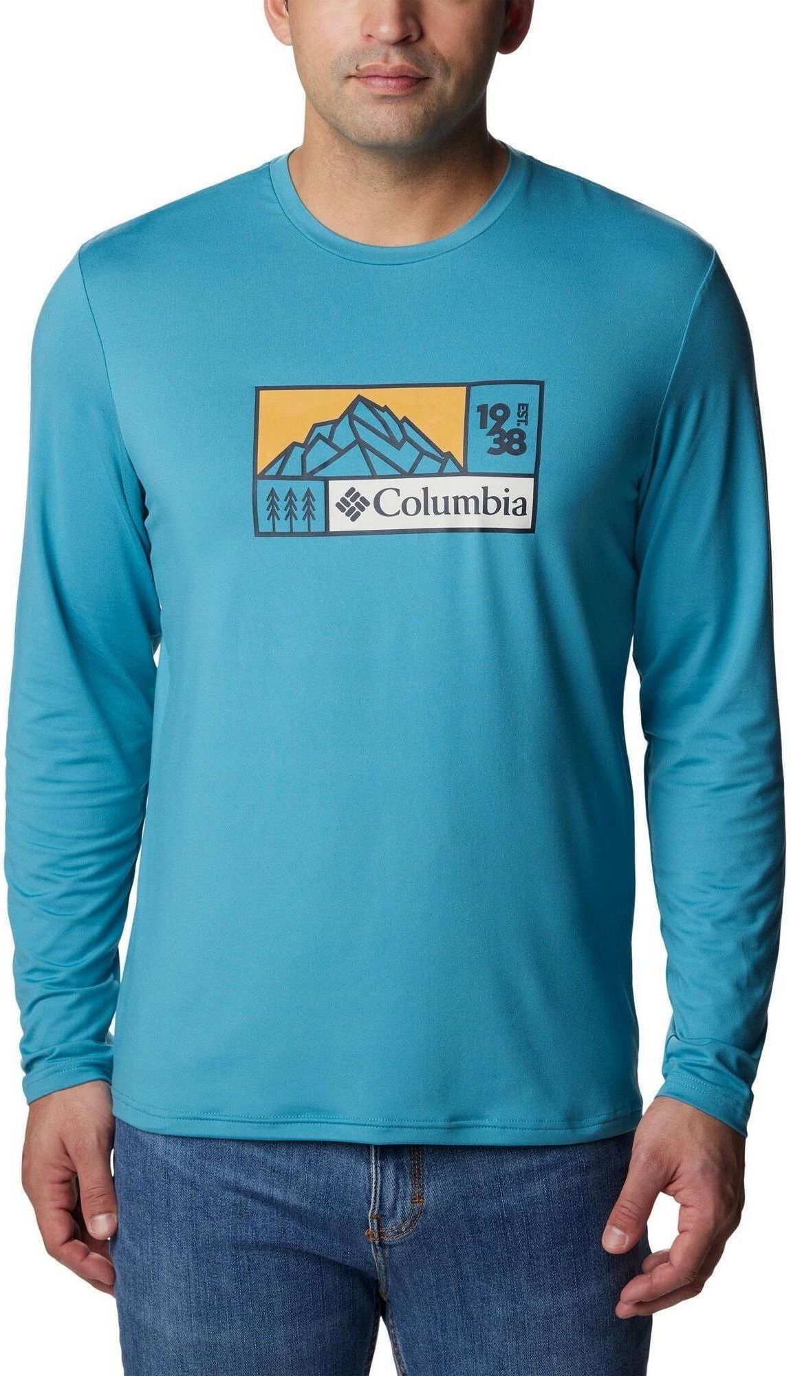 Tech Trail Long Sleeve Graphic to męska techniczna koszulka sportowa z długim rękawem marki Columbia z dużym nadrukiem na piersi.