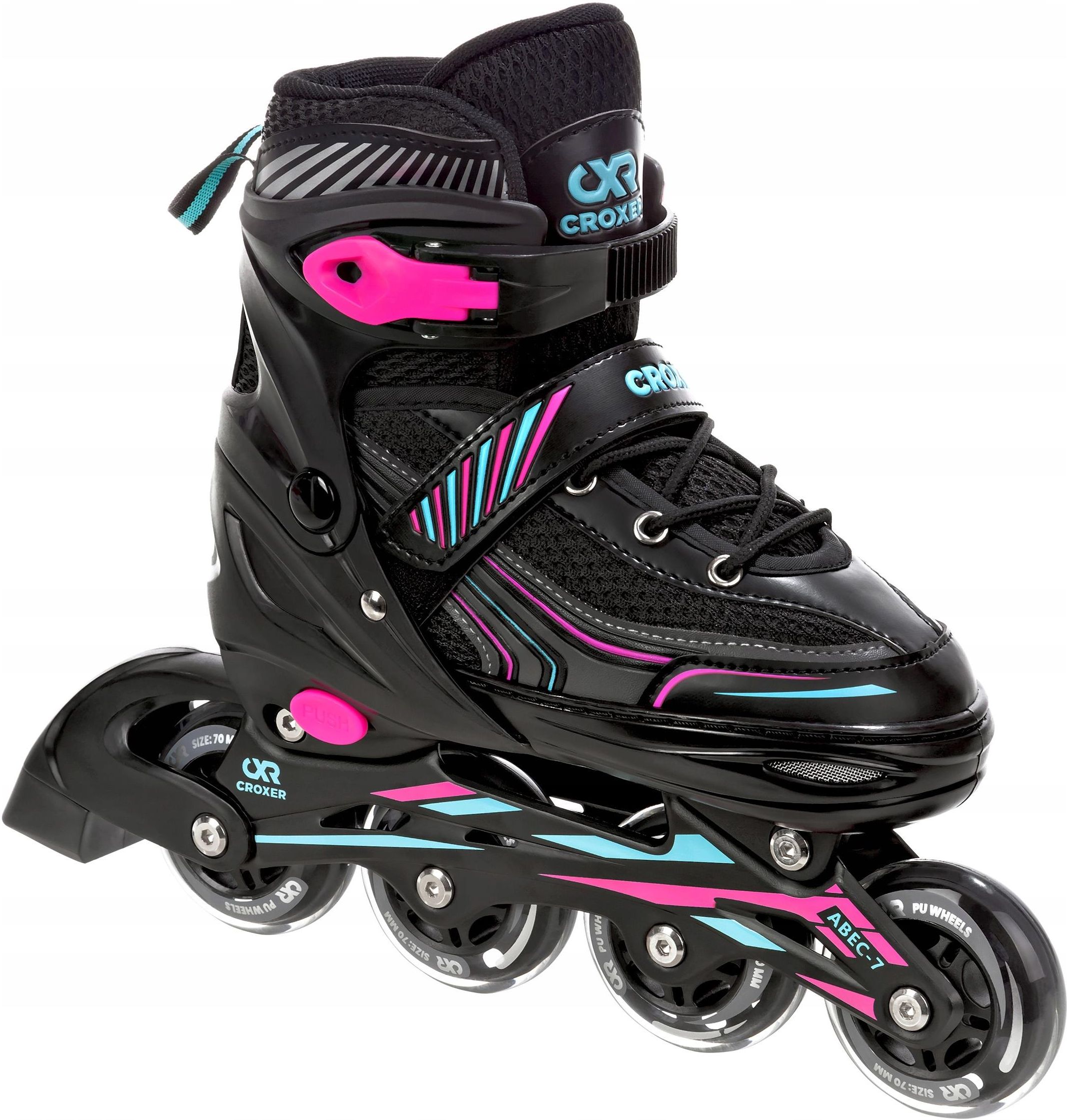 4w1 Rolki, Rolko-Wrotki, Wrotki Łyżwy Croxer Optima Mint/Pink 31-34 (rozmiar regulowany 18,5cm - 20,5cm) Marka: Croxer Model: Optima Rozmiar regulowany: 31-34 Rozmiar w centymetrach: 18,5cm - 20,5cm Łożyska: Abec7 Rozmiar kółek: 64mm Kółka: PU - kauczuk Twardość kółek: 82A Płoza: Aluminiowa Bardzo lekka i wytrzymała półmiękka skorupa z poliwęglanu Trzystopniowe zapięcie - sznurówki, rzep, klamra Double foam - podwójna pianka wyściełająca wnętrze buta Bardzo trwały poliwęglanowy hamulec Łożyska ABEC-7 Płoza aluminiowa - bardzo lekkie i wytrzymałe aluminium Kółka kauczukowe - 64mm Vent-System - system wentylacji Trust-Fit-Sytem - idealnie dopasowujący się but do stopy SAS - Shock-Absorbing-System - system pochłaniający drgania Hamulec jest tylko przy prawym bucie, tak jak u wszystkich producentów rolek. Hamulec można przełożyć do lewego buta. Rolki posiadają regulowany rozmiar w zakresie podanym w ofercie W zestawie znajdują się się fabrycznie naostrzone płozy łyżwowe, klucze, śruby oraz dłuższe osie umożliwiające odkręcenie kółek i zamontowanie ich po obu stronach płozy rolkowej celem uzyskania pożądanej konfiguracji. Przełożenie kół nie wymaga wiedzy technicznej, jest przystępnie pokazane w dołączonej instrukcji obsługi i nie wymaga odkręcania płozy rolkowej. Rolki regulowane Rozmiar rolki regulujemy poprzez naciśnięcie przycisku mechanizmu regulacji i wysunięciu przedniej części skorupy buta.