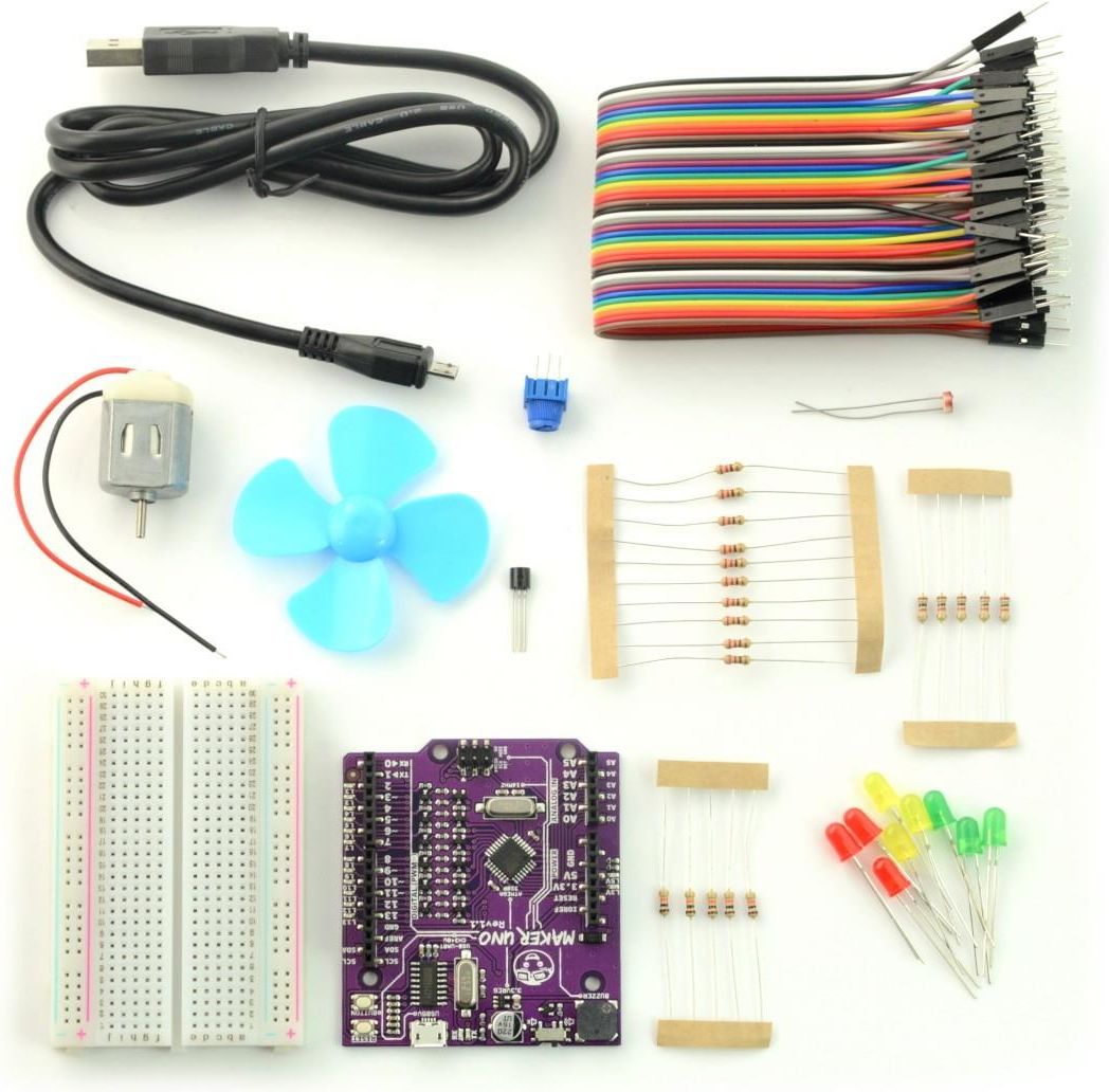 Cytron Maker Uno ATmega328 Edu KIT - zestaw startowy + moduł zgodny z Arduino Zestaw elementów elektronicznych ułatwiających rozpoczęcie pracy z modułem Maker UNO. W komplecie m.in.: diody LED, rezystory, silnik, potencjometr, płytkę stykową, wiatraczek i przewody. Zestaw zawiera moduł Maker UNO. …