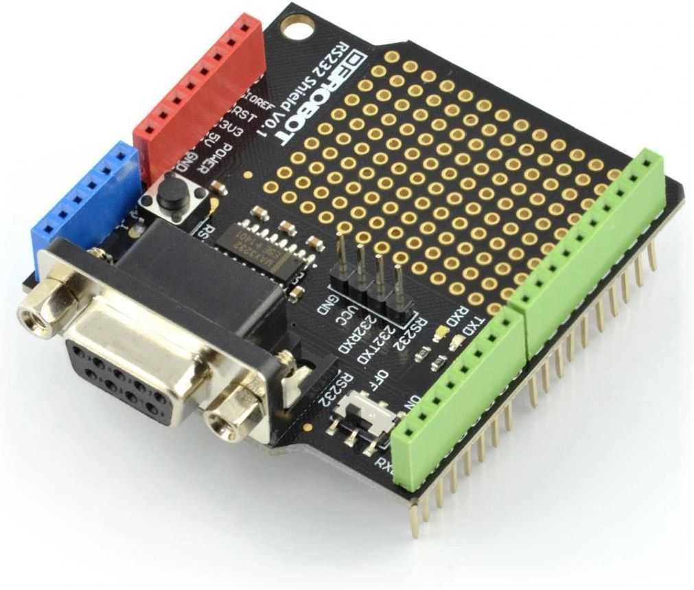 Nakładka do Arduino pozwalająca na przesyłanie danych za pośrednictwem popularnego protokołu RS232. Posiada zamontowane gniazdo DB9.