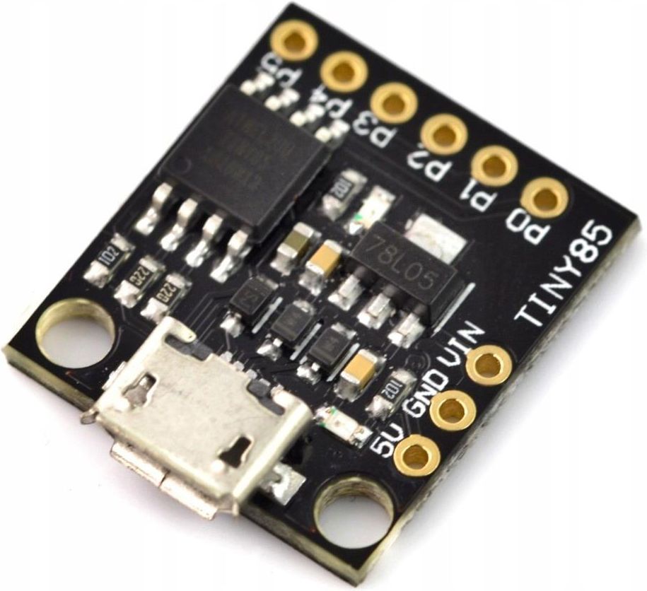 Digispark - ATtiny85 Mini Mikrokontroller - 5V Miniaturowy moduł z mikrokontrolerem ATtiny85, wyposażony w 8 kb pamięci Flash oraz 6 portów I/O. Na płytce znajduje się złącze microUSB, dzięki któremu układ można programować poprzez środowisko Arduino IDE. Napięcie zasilania wynosi 5 V lub od 7 V do 35 V. Produkt występuje w dwóch wersjach wysyłanych losowo, nie różnią się specyfikacją. Indeks: GRL-14010 Specyfikacja modułu ATtiny85 Mini Mikrokontroller Mikrokontroler ATtiny85: Pamięć Flash: 8 kb (z czego 2,75 kB zajęte przez bootloader) Taktowanie: 16 MHz Bootloader USB z możliwością programowania poprzez środowisko Arduino IDE Złącze microUSB do programowania, w naszej ofercie znajdziesz odpowiedni przewód Zamontowany regulator napięcia 5,0 V o wydajności prądowej do 500 mA umożliwiają podłączenie napięcia zasilania do 35 V. Możliwość zasilania z portu USB lub z zewnętrznego źródła Na płytce znajdują się dwie diody LED: zasilanie oraz dla użytkownika, podłączona do pinu 1. 6 pinów cyfrowych wejścia/wyjścia, w tym: 4 ADC 3 kanały PWM interfejs I2C i SPI Dwa otwory montażowe o średnicy 2,1 mm Wymiary: 21 x 18 mm / 24 x 18 mm W zestawie: złącze goldpin