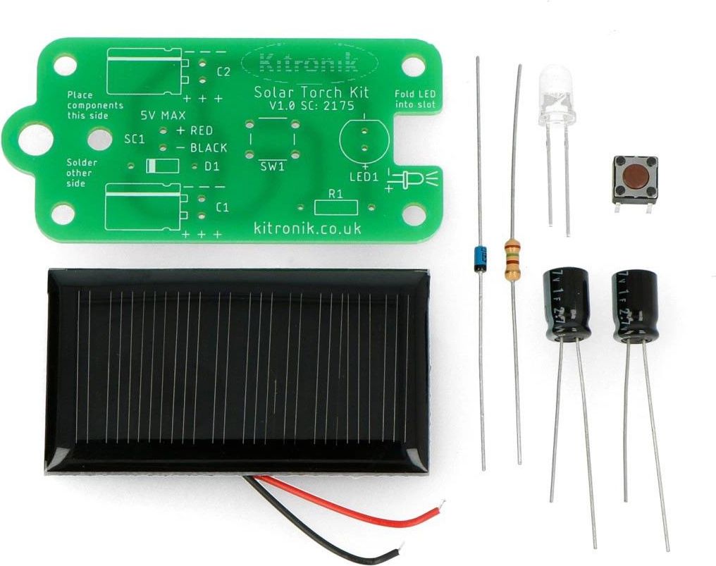 Solar Kit firmy Kitronik to zestaw do budowy latarki, który pełni jednocześnie funkcję dydaktyczną. Na podstawie oferowanego zestawu można w prosty sposób przyswoić wiedzę dotyczącą podstaw elektroniki oraz konstrukcji podstawowych elementów elektronicznych. Płytka PCB, zawarta w zestawie, została zaprojektowana w taki sposób, aby możliwe było przymocowanie jej do breloczka. Dzięki temu skonstruowana latarka będzie mogła być wygodnie przenoszona.
