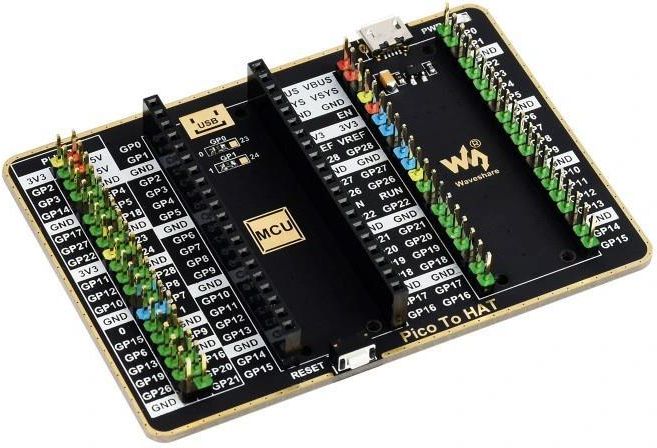 Ekspander wyprowadzeń stworzony przez Waveshare, przeznaczony został do pracy z modułem Raspberry Pi Pico. Płytka wyposażona została w 40-pinowe złącze zgodne z wyprowadzeniami standardowej wersji minikomputera Raspberry Pi. Na płytce można również znaleźć złącze męskie 2x 20-pin z opisanymi wyprowadzeniami Raspberry Pi Pico. Moduł Raspberry Pi Pico wpinany jest w gniazdo 2x 20-pin oznaczone jako MCU, a kierunek wpięcia oznaczony jest złączem USB Raspberry Pi Pico. Płytka wyposażona jest również w przycisk Reset oraz dodatkowe złącze microUSB.
