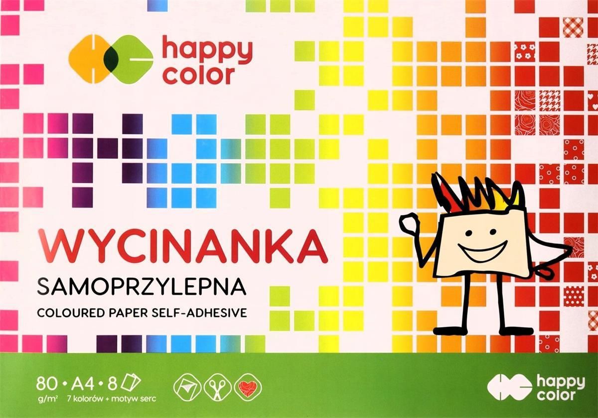 Happy Color Blok wycinanka samoprzylepna A4 - Blok z kolorowym papierem samoprzylepnym w 8 intensywnych barwach - Jeden arkusz zawiera nadrukowane serca z różnymi motywami - Świetne do wykorzystania w tworzeniu laurek i kartek okolicznościowych - Zawiera 8 arkuszy o gramaturze 80g - Format A4