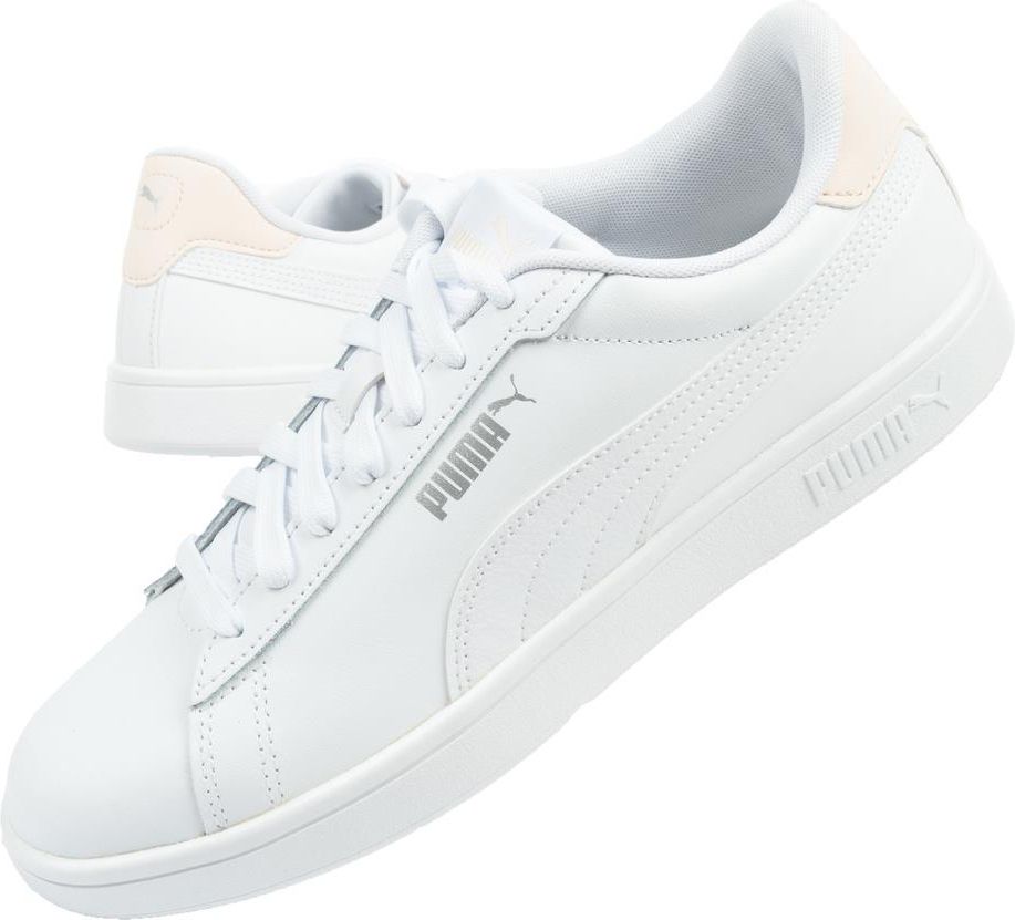 Buty sportowe Puma Smash 3.0 L W 39098719 Właściwości Niemiecka marka Puma to jeden z gigantów branży obuwia i odzieży sportowej, doskonale znany wszystkim miłośnikom sportowego stylu życia.. Klasyczne buty damskie idealne do codziennych, sportowych stylizacji. Cholewka w prezentowanych powyżej butach Puma wykonana jest z bardzo miękkiej skóry licowej o wysokiej odporności na zniszczenia, która zapewnia komfort cieplny i idealne dopasowanie. Model ten posiada niezwykle komfortową wkładkę SoftFoam o piankowej strukturze, która jest miękka i zapamiętuje kształt stopy, dopasowując się do niej. Ponadto technologia SoftFoam posiada powłokę przeciw zapachową, by stopy miały zapewnione świeże środowisko oraz zapewnia efekt chłodzenia, nie zatrzymując ciepła. Kolejnym elementem damskiego obuwia Puma Smash jest gumowa podeszwa zewnętrzna o niskim profilu i płaskiej konstrukcji, która zapewnia przyczepność do nawierzchni i jest odporna na ścieranie. Idealne obuwie do każdej miejskiej stylizacji. Materiał skóra licowa Kolor biały