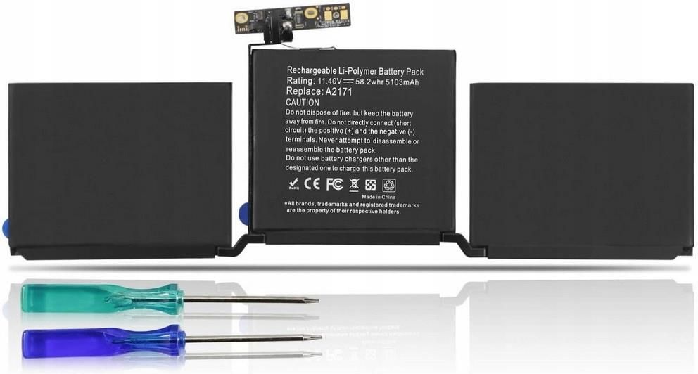 Bateria A2171 do MacBook Pro 13 A2159 2019 / A2289 2020 / A2338 M1 2020 Kompatybilność MacBook Pro 13 A2159 2019 MacBook Pro 13 A2289 2020 MacBook Pro 13 A2338 M1 2020 Numer części: A2171 Rodzaj ogniw: Litowo-polimerowe Pojemność: 5103 mAh 58.2 Wh Napięcie: 11.41V Certyfikaty: CE, RoHS Stan: Fabrycznie nowa Zabezpieczenia elektroniczne: przeciwprzepięciowe, przed przegrzaniem, przed nadmiernym rozładowaniem, przed przeładowaniem Zestaw zawiera 1x Bateria 2x Śrubokręt 1x Kartonowe opakowanie Opis i cechy produktu Najwyższej jakości ogniwa w technologii litowo-polimerowej Nowoczesny układ sterujący gwarantuje pełną kompatybilność oraz maksymalne bezpieczeństwo Precyzyjne wykonanie i wysokiej jakości materiały użyte do produkcji zapewniają idealne dopasowanie do obudowy MacBook'a Akumulatory posiadają zabezpieczenia przed przeciążeniem, przegrzaniem, zwarciem oraz mają odporność na niskie temperatury Do zestawu dołączone są dwa śrubokręty potrzebne do wymiany baterii Kompatybilność Macbook Pro 13" Touch Bar M1 A2338 z 2020: MYDA2LL/A, MYD82LL/A, MYDC2LL/A, MYD92LL/A Macbook Pro 13" Touch Bar A2289 z 2020: MXK62LL/A, MXK72LL/A, MXK32LL/A, MXK52LL/A Macbook Pro 13" Touch Bar A2159 z 2019: MUHQ2LL/A, MUHR2LL/A, MUHN2LL/A, MUHP2LL/A Uwagi Jeżeli po przeprowadzonym montażu występuje problem z działaniem baterii lub MacBook jej nie widzi, należy przeprowadzić reset SMC. Po zresetowaniu SMC bateria powinna być ładowana przez około 45 minut i po tym czasie można uruchomić ponownie MacBooka. Kalibracja Aby uzyskać optymalną wydajność, skalibruj nowo zainstalowaną baterię: naładuj ją do 100% i ładuj przez co najmniej 2 kolejne godziny. Następnie używaj urządzenia, aż wyłączy się z powodu niskiego poziomu naładowania baterii. Na koniec naładuj go nieprzerwanie do 100%.