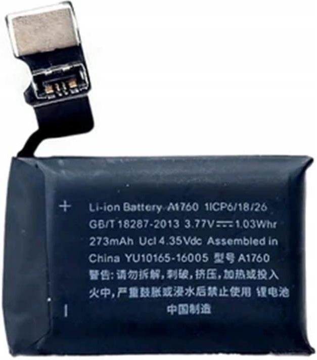 Bateria akumulator A1760 do Apple Watch Series 2 (38mm) Dedykowany model: Apple Watch Series 2 (38mm) Numer części: A1760 Pojemność: 273mAh Specyfikacja: 3.77V 1,03Wh Typ akumulatora: Litowo-jonowy Klasa jakościowa: HQ Zestaw zawiera 1x Bateria Opis i cechy produktu Bateria do zegarka Apple Watch