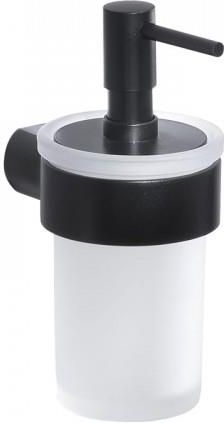 Dozownik mydła wykończenie czarny mat Materiał Cromall® (opatentowany materiał ze stopu metali) materiał pojemnika szkło mleczne Średnica wymiaru 69 mm rozmiar 152 x 108 mm pojemność 110 ml instalacja poprzez wiercenie w ścianie