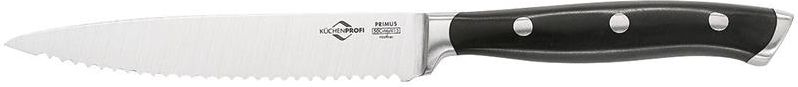 Nóż uniwersalny 12 cm KUCHENPROFI KU-2410042812 Ząbkowany nóż do różnych zadań kuchennych, takich jak krojenie warzyw, owoców i mniejszych porcji mięsa. Ostrze noża wykonane jest z martenzytycznej stali chirurgicznej 50CrMoV15, o dużej zawartości węgla (0,50%) oraz wanadu (0,15%). Jest to wysokiej …