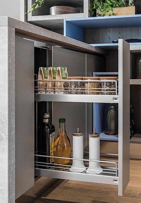 WYCIĄG WĄSKI 2-PÓŁKOWY SILVER 3D-X 04.406.S Wysokość światła szafki min. 542 mm Szerokość światła szafki min. 112 mm Głębokość światła szafki min. 481 mm Szerokość kosza 100 mm Obciążenie całego systemu 12 kg Linia koszy ARENA Classic Silver Kolor relingu szary Kolor Szary Ilość koszy 2 Wyciąg podblatowy do szafek dolnych. Dedykowany jest do bardzo wąskich szafek kuchennych i małych przestrzeni użytkowych. Mocowany do frontu szafki, doskonale sprawdza się jako podręczny schowek na wąskie przybory kuchenne, na butelki oraz na przyprawy, czy inne artykuły spożywcze.System jest tak skonstruowany, że stanowi integralną całość ze sobą, dostępny jest jako kompletne cargo z dwoma zintegrowanymi półkami. Wykonany ze stali malowanej proszkowo w kolorze srebrnym. Każda z półek posiada fakturowane dno, które spełnia funkcję antypoślizgową, a boczne ścianki wykończenie są trzema okrągłymi relingami. Cargo posiada dwie prowadnice, montowane zawsze do prawej strony korpusu szafki, co dodatkowo zapewnia większą stabilizację systemu. Główny mechanizm doposażony jest w adaptery wspomagające wpięcia stelaża w prowadnice oraz ułatwiające regulację frontu w trzech płaszczyznach bez konieczności demontażu systemu. Całkowite obciążenie tego bardzo wąskiego wyciągu jest bardzo duże i wynosi 12 kg (masa własna mechanizmu wraz z frontem + ładowność), natomiast obciążenie jednego koszyka to nawet max.6 kg.Zastosowana nowoczesna technologia w procesie produkcji gwarantuje użytkownikowi niewielką siłę potrzebną do otwarcia systemu, a płynny ruch i adaptacyjny system wyhamowania dba o delikatne i ciche zamykanie (cichy domyk umieszczony jest w górnej prowadnicy). W rozwiązaniu zastosowano prowadnice z pełnym wysuwem, by wszystko było łatwo dostępne, nawet, gdy system znajduje się w najdalszym i najmniej dogodnym miejscu.Kompletny zestaw systemu wraz z szafką pokazany na zdjęciach jest tylko propozycją aranżacji i jako całkowity komplet nie stanowi oferty sprzedażowej. Szafkę należy wykonać w własnym zakresie. Dla swobodnego wysuwania carga należy stosować standardowe uchwyty meblowe lub meblowe listwy podblatowe, system nie jest kompatybilny w przypadku zastosowania frontów bezuchwytowych.