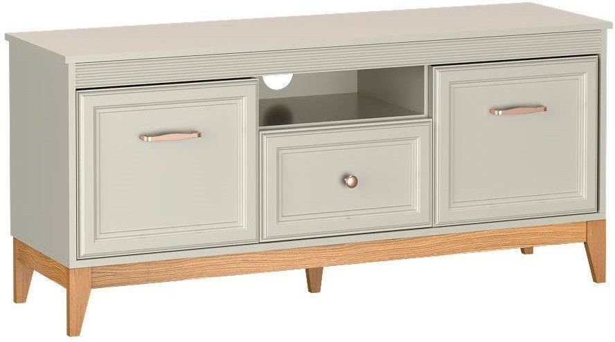 Stylowa szafka RTV WINDSOR od marki JARSTOL to wyjątkowy mebel, który łączy klasyczną elegancję z nowoczesną funkcjonalnością. Utrzymana w subtelnym odcieniu cashmere, wprowadza do salonu ciepły, harmonijny klimat, a jej frezowane fronty i dekoracyjna listwa podblatowa podkreślają wyrafinowany charakter całej kolekcji. To idealna szafka pod telewizor dla osób ceniących estetykę, porządek i ponadczasowy styl we wnętrzach. RTV z szufladą i szafkami – wygodne przechowywanie i idealna organizacja Szafka została zaprojektowana tak, aby ułatwiać codzienne korzystanie ze sprzętu multimedialnego. Posiada pojemną szufladę na drobne akcesoria oraz dwie boczne szafki z frontami, które pomieszczą kable, dokumenty czy płyty. Centralna otwarta wnęka świetnie sprawdzi się dla dekodera, konsoli lub routera, zapewniając łatwy dostęp do urządzeń. Drzwi szafek wyposażono w zawiasy z cichym domykiem, co gwarantuje komfort i elegancję użytkowania. To szafka RTV do salonu, która zachwyca funkcjonalnością i dopracowaną formą. Dębowe nogi i stylowe detale, które podkreślają jakość Solidną konstrukcję mebla wspierają nogach z litego drewna dębowego o wysokości 15 cm, które dodają bryle lekkości i naturalnego uroku. Subtelne metalowe uchwyty w kolorze miedzi tworzą elegancki kontrast z kaszmirowym wykończeniem frontów, nadając całości prestiżowego charakteru. Dzięki harmonijnemu połączeniu estetyki i funkcjonalności, szafka RTV WINDSOR JARSTOL stanowi idealne uzupełnienie salonu urządzonego w stylu klasycznym lub nowoczesnej klasyki, a w zestawie z innymi meblami WINDSOR tworzy spójne, eleganckie wnętrze. Wymiary Szerokość: 135,5 cm Głębokość: 40,5 cm Wysokość: 61,5 cm