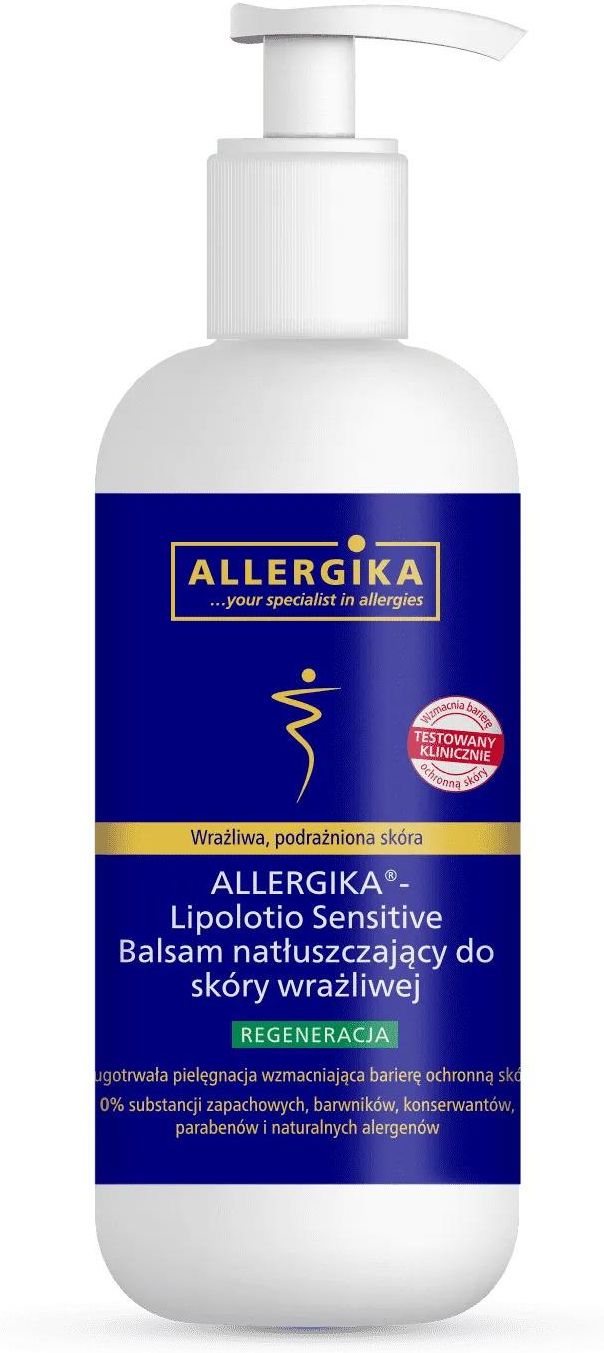 ALLERGIKA® - Lipolotio Sensitive w opakowaniu XXL. Aż 500ml Długotrwałe działanie potwierdzone badaniami klinicznymi. ALLERGIKA® - Lipolotio Sensitive to natłuszczający balsam stworzony specjalnie do codziennej pielęgnacji skóry wrażliwej i suchej, wymagającej wyjątkowej uwagi. Balsam wzmacnia barierę ochronną skóry, łagodzi swędzenie i podrażnienia oraz głęboko nawilża, pozostawiając ochronny film lipidowy. Dzięki specjalnej formule wody w oleju (W/O) intensywnie natłuszcza skórę, zapewniając jej komfort przez cały dzień. Składniki aktywne • Gliceryna 10% – wiąże wodę, zapobiegając przesuszeniu. • Bisabolol – działa kojąco i łagodzi podrażnienia. • Witamina E – wzmacnia ochronną barierę naskórka, przeciwdziałając szkodliwym czynnikom zewnętrznym. BADANIA KLINICZNE W badaniach klinicznych wykazano, że ALLERGIKA® - Lipolotio Sensitive zapewnia długotrwały efekt barierowy, znacznie przedłużając nawilżenie skóry. Zastosowana w produkcie formuła wody w oleju (W/O) tworzy na skórze warstwę ochronną, która zapobiega utracie wody z naskórka. Dlatego ALLERGIKA®- Lipolotio Sensitive jest szczególnie polecany do długoterminowej, zapobiegawczej pielęgnacji suchej skóry, natomiast ALLERGIKA®- Hydrolotio Sensitive sprawdza się w pielęgnacji skóry z zaostrzonymi objawami skórnymi. Dla kogo? Idealny dla wrażliwej, suchej skóry oraz dla osób, które zmagają się z objawami AZS, łuszczycy, egzemy. Dlaczego warto wybrać ALLERGIKA® - Lipolotio Sensitive? • Jest przebadany klinicznie • Głęboko natłuszcza i regeneruje suchą skórę. • Tworzy barierę ochronną, zapobiegając dalszemu przesuszeniu. • Łagodzi swędzenie i redukuje zaczerwienienia. • Bez substancji zapachowych, konserwantów, parabenów i barwników. • Idealny do pielęgnacji skóry po kąpieli lub prysznicu. Jak stosować balsam ALLERGIKA® - Lipolotio Sensitive? Balsam używaj kilka razy dziennie, nakładając na zmienione miejsca skóry. Po ustąpieniu objawów, aplikuj profilaktycznie, zwłaszcza wieczorem. W przypadku wystąpienia intensywnego świądu, polecamy stosowanie produktu w połączeniu z balsamem ALELRGIKA®- Hydrolotio Sensitive. Sposób użycia W przypadku suchej, wymagającej szczególnej pielęgnacji skóry zalecamy stosowanie ALLERGIKA®- Lipolotio Sensitive rano lub kilka razy dziennie. Przy pierwszych objawach swędzenia, zalecamy stosować w połączeniu z Balsamem nawilżającym do skóry wrażliwej ALLERGIKA®- Hydrolotio Sensitive. Po ustąpieniu swędzenia nakładać regularnie na skórę, w szczególności wieczorem po prysznicu lub kąpieli. Składniki (INCI: Ingredients): Aqua, Glycerin, Butylene Glycol, Isopropyl Myristate, Caprylic/Capric Triglyceride, Paraffinum Liquidum, Cetyl PEG/PPG-10/1 Dimethicone, Tocopheryl Acetate, Sodium Chloride, Cera alba, Hydrogenated Castor Oil, Bisabolol