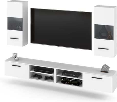 MEBLOŚCIANKA BLANKA FRONTY: BIAŁY MAT / KORPUS BIAŁY SPECYFIKACJA – w witrynach szkło czarne przezroczyste – uchwyty czarne, matowe, plastikowe, rozstaw 128 mm – korpus wykonany z płyty laminowanej grubości 16 mm o zwiększonej odporności na zadrapania – fronty wykonane z płyty MDF lakierowanej na wysoki połysk lub laminowanej o grubości 16 mm. SKŁAD ZESTAWU W skład zestawu wchodzą dwie wiszące rtv i dwie wiszące witryny oraz wszystkie akcesoria i instrukcja do montażu. WYMIARY RTV ma 120 cm szerokości / 35 cm wysokości / 40 cm głębokości Witryna ma 40 cm szerokości / 100 cm wysokości / 30 cm głębokości Waga 100 kg Wymiary 240 × 40 × 120 cm Liczba drzwi 4 Montaż meble do samodzielnego montażu Stan Nowy Liczba elementów w zestawie 4