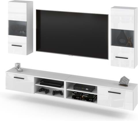 MEBLOŚCIANKA BLANKA FRONTY: BIAŁY POŁYSK / KORPUS BIAŁY SPECYFIKACJA – w witrynach szkło czarne przezroczyste – uchwyty czarne, matowe, plastikowe, rozstaw 128 mm – korpus wykonany z płyty laminowanej grubości 16 mm o zwiększonej odporności na zadrapania – fronty wykonane z płyty MDF lakierowanej na wysoki połysk lub laminowanej o grubości 16 mm. SKŁAD ZESTAWU W skład zestawu wchodzą dwie wiszące rtv i dwie wiszące witryny oraz wszystkie akcesoria i instrukcja do montażu. WYMIARY RTV ma 120 cm szerokości / 35 cm wysokości / 40 cm głębokości Witryna ma 40 cm szerokości / 100 cm wysokości / 30 cm głębokości Waga 100 kg Wymiary 240 × 40 × 120 cm Liczba drzwi 4 Montaż meble do samodzielnego montażu Stan Nowy Liczba elementów w zestawie 4