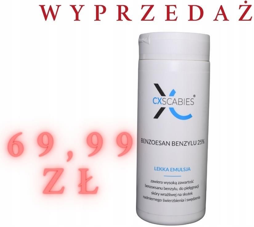 CXSCABIES ANTYPASOŻYTNICZA EMULSJA 25 % BENZOESANU BENZYLU Świerzb to choroba skóry wywołana przez roztocze Sarcoptes scabiei, której głównym objawem jest intensywne swędzenie. Jeśli masz podejrzenie świerzbu lub objawy skórne, które wydają się być nietypowe lub trwają dłużej niż zwykle, niezwłocznie skonsultuj się z lekarzem. Poprawna diagnoza i leczenie są kluczowe dla szybkiego powrotu do zdrowia i uniknięcia powikłań. Produkt sprzedawany bez recepty Do zwalczania pasożytów skórnych takich jak świerzbowiec, nużeniec. Emulsję stosujemy u wszystkich członków rodziny, nawet jeśli nie wykazują objawów choroby Warto zawsze stosować higienę osobistą i dbać o czystość swojego otoczenia, aby zmniejszyć ryzyko zakażenia świerzbem i innych chorób skóry. Rozpoznanie i leczenie świerzbu we wczesnym stadium jest kluczowe, aby zapobiec rozprzestrzenianiu się choroby i minimalizować ryzyko powikłań. SPOSÓB UŻYCIA: Przed użyciem wstrząsnąć. Preparat nakładaj na oczyszczoną suchą skórę całego ciała z pominięciem twarzy oraz skóry głowy. Stosować 2 dni z rzędu na suchą skórę po wieczornej kąpieli, na całe ciało z wyjątkiem twarzy i głowy. Po 24 godzinach zmyć wodą z mydłem. Smarowanie można powtórzyć na 3 dzień, ale nie stosować dłużej. Dzieci powyżej 3 roku stosować 1 raz i po 12 godzinach zmyć wodą z mydłem. Dla dzieci w wieku 3-6 lat można rozcieńczyć 2:1 (emulsja 2:1 woda) PRZECIWWSKAZANIA: Nie stosować u dzieci poniżej 3 roku życia i kobiet w ciąży Nie stosować u osób uczulonych na składnik benzoesan benzylu ŚRODKI OSTROŻNOŚCI: Unikać kontaktu z oczami i błonami śluzowymi ust i nosa. W przypadku kontaktu z oczami i błonami śluzowymi ust i nosa należy dokładnie te miejsca przepłukać wodą SKŁAD: Aqua, benzyl benzoate, Glycereth - 8, Ethylexanoate, Glycerth - 18 Coco — caprylate/cprote, Polysorbate 80, ceteryl, Alkohol, Ceteryl Glucoside, Aminomethyl Propanol