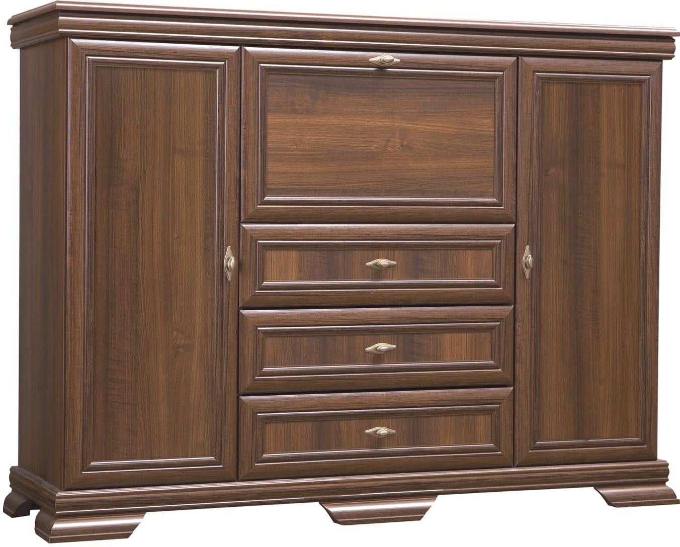Elegancka wysoka komoda z kolekcji Kora z barkiem, dwiema szafkami i trzema szufladami. Dodatki w postaci ozdobnych uchwytów, szykownych nóżek w połączeniu z naturalną kolorystyką nadają klasy i charakteru każdej aranżacji.