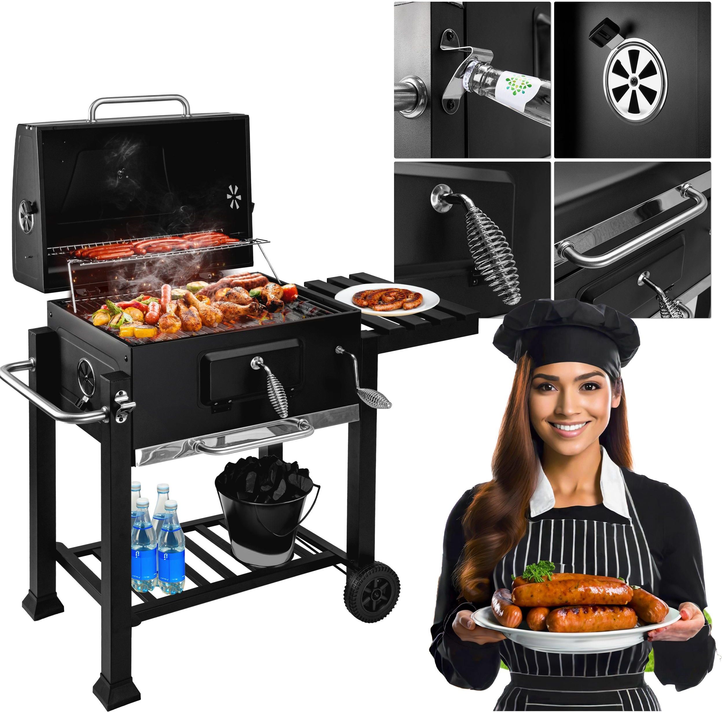 DUŻY GRILL WĘGLOWY NA KÓŁKACH OGRODOWY GRILL POKRYWKA TERMOMETR POPIELNIK Grill węglowy z pokrywą na kółkach Mejor to idealny wybór dla miłośników grillowania, którzy cenią sobie jakość i funkcjonalność. Wykonany z wytrzymałej stali malowanej proszkowo, łączy trwałość z eleganckim wyglądem, co czyni go doskonałym elementem każdego ogrodu lub tarasu. Duży, chromowany ruszt oraz półka do podgrzewania zapewniają wystarczającą przestrzeń do przygotowywania różnorodnych potraw, co jest idealne na spotkania rodzinne i z przyjaciółmi. Dodatkowe udogodnienia, takie jak precyzyjny termometr, otwory do regulacji powietrza, wygodne uchwyty, otwieracz do butelek, drzwiczki rewizyjne oraz wyjmowany popielnik, sprawiają, że grillowanie staje się komfortowe, efektywne i niezwykle przyjemne., Najważniejsze cechy ✨ Rodzaj grilla: Węglowy: Tradycyjny sposób grillowania, który nadaje potrawom wyjątkowy smak. Materiał grilla: Stal malowana proszkowo: Wytrzymała konstrukcja zapewniająca długą żywotność grilla. Ruszt ze stali pokryty chromem: Duży ruszt idealny do grillowania różnorodnych potraw. Półka do podgrzewania ze stali pokryta chromem: Duża półka umożliwia podgrzewanie gotowych potraw. Wygodne uchwyty: Ergonomiczne uchwyty ułatwiają obsługę grilla. Termometr w pokrywie: Precyzyjny termometr do 430°C umożliwia kontrolę temperatury wewnątrz grilla. Cztery otwory do regulacji dopływu powietrza: Zapewniają dostosowanie optymalnej temperatury grillowania. Wmontowany otwieracz do butelek: Praktyczny dodatek dla wygody użytkowania. Drzwiczki rewizyjne: Ułatwiają dokładanie brykietu bez potrzeby podnoszenia całej pokrywy. Wyjmowany popielnik w formie szuflady: Łatwe i szybkie czyszczenie grilla. Regulacja wysokości paleniska za pomocą uchwytu: Wygodny sposób regulacji wysokości paleniska. Kółka ułatwiające transport grilla: Mobilność i wygoda przemieszczania grilla. Pojemna dolna półka: Dodatkowe miejsce na przechowywanie akcesoriów do grillowania. Boczna półka: Praktyczne miejsce na przygotowanie i przechowywanie potraw. Palenisko z otworami do popiołu: Efektywne odprowadzanie popiołu, co ułatwia czyszczenie. Mocne zawiasy pokrywy: Zapewniają trwałość i bezpieczeństwo użytkowania. Specyfikacja Rodzaj grilla: Węglowy Materiał grilla: Stal malowana proszkowo Waga: 24 Wymiary Wysokość: 95 cm Szerokość: 109 cm Głębokość: 33 cm Ruszt: 45x30 cm Ruszt do podgrzewania: 39x20 cm Półki: 33x30 cm Kółka: 15 cm Waga: 18 kg Zalety wbudowanego termometru Precyzyjne monitorowanie temperatury: Umożliwia ścisłe śledzenie aktualnej temperatury wewnątrz grilla, co jest kluczowe dla optymalnego przygotowania różnorodnych potraw. Doskonałe wyniki grillowania: Precyzja w kontrolowaniu temperatury pozwala na idealne dopasowanie warunków do rodzaju przygotowywanego mięsa, ryb czy warzyw, gwarantując doskonałe rezultaty za każdym razem. Zmniejszenie ryzyka przypalenia: Dzięki stałemu monitorowaniu temperatury ryzyko przypalenia jedzenia jest znacząco zredukowane. Optymalizacja zużycia węgla: Wiedząc, jaką temperaturę aktualnie osiągnął grill, można efektywniej zarządzać zużyciem węgla, dodając go tylko wtedy, gdy jest to faktycznie potrzebne. Bezpieczeństwo: Monitorowanie temperatury pozwala uniknąć niebezpieczeństwa związanego z nadmiernym nagrzewaniem grilla, co może prowadzić do uszkodzeń lub nawet pożaru. Komfort użytkowania: Termometr wbudowany w obudowę grilla jest zawsze pod ręką, eliminując potrzebę stosowania dodatkowych urządzeń do pomiaru temperatury. Zalety możliwości regulacji przepływu powietrza w grillu: Precyzyjna kontrola temperatury: Umożliwia dokładne dostosowanie temperatury, co jest kluczowe dla prawidłowego przygotowania potraw. Lepsze wyniki grillowania: Równomierne grillowanie zapewnia lepszy smak i teksturę jedzenia. Oszczędność opału: Kontrola powietrza redukuje zużycie węgla lub drewna, czyniąc grillowanie bardziej ekonomicznym. Szybsze rozpalanie: Przyspiesza proces rozpalania, pozwalając szybciej rozpocząć grillowanie. Zwiększone bezpieczeństwo: Minimalizuje ryzyko nadmiernego nagrzewania i pożaru. Wszechstronność potraw: Umożliwia stosowanie różnych technik grillowania, dostosowanych do rodzaju dań. Stabilne warunki grillowania: Utrzymanie stabilnej temperatury nawet przy zmiennej pogodzie. Dłuższa żywotność grilla: Pomaga w utrzymaniu grilla w dobrym stanie przez zmniejszenie osadzania się sadzy.