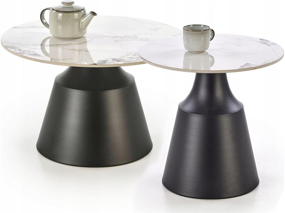 Zestaw ław MAGNETA Halmar blat biały marmur + czarny Elegancja i funkcjonalność w jednym zestawie Zestaw dwóch okrągłych ław Magneta to rozwiązanie, które doskonale komponuje się z nowoczesnymi wnętrzami. Białe marmurowe blaty oraz czarna stalowa podstawa tworzą harmonię, łącząc styl z codzienną praktycznością. Niezwykła jakość materiałów Blaty ze spieku to gwarancja trwałości i łatwej pielęgnacji . Gładka powierzchnia odpornie znosi zarysowania, a stożkowa stalowa podstawa zapewnia stabilność, dodając meblowi eleganckiego wyglądu. Przestrzeń zyskuje na funkcjonalności Zestaw ław o różnej średnicy to idealne rozwiązanie do różnych przestrzeni. Większa ława może służyć jako stolik kawowy, a mniejsza to doskonała powierzchnia pomocnicza lub dekoracja . Możliwość wsunięcia mniejszej ławy pod większą oszczędza cenne miejsce co sprawia, że zestaw sprawdzi się nawet w mniejszych pomieszczeniach. Design, który przetrwa próbę czasu Dzięki zastosowaniu wysokiej jakości materiałów zestaw ław Magneta wyróżnia się nie tylko nowoczesnym wyglądem, ale również odpornością na codzienne użytkowanie . Samodzielny montaż: Tak Styl: Industrialny / Loftowy Dostępna kolorystyka: Biały marmur + czarny Wysokość: 43 / 48 Średnica: 70 / 50 Materiał: Spiek + stal malowana proszkowo Blat: Spiek Stelaż: Stal malowana proszkowo Kolor stelaża: Czarny Oświetlenie LED: Brak Kształt: Okrągły Szuflady: Brak szuflad Otwarte półki: Brak Kraj produkcji: Chiny