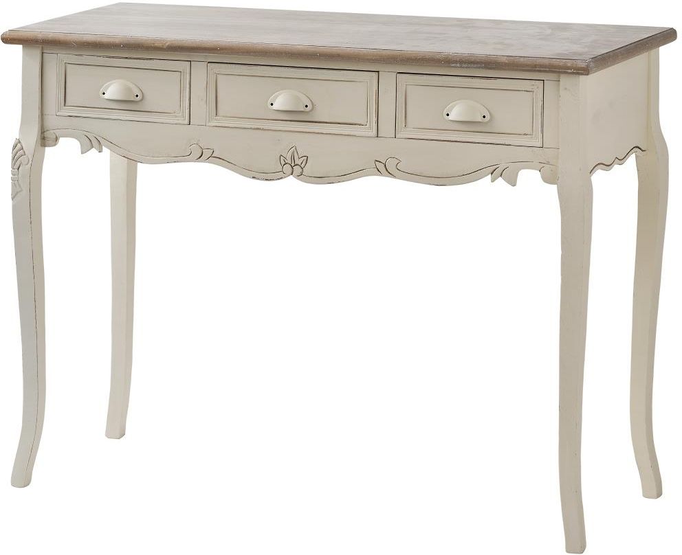 Rimini 017 Konsola -sekretarzyk 3S prowansalska kremowa beżowy blat drewno/mdf Sekretarzyk prowansalski stylizowany z giętymi nogami wyposażony w 3 szufladki. Wymiary Szerokość (cm): 110 Wysokość (cm): 78 Głębokość (cm): 40 Dane techniczne odległość od podłogi do najniższego miejsca konsoli: 55 cm …