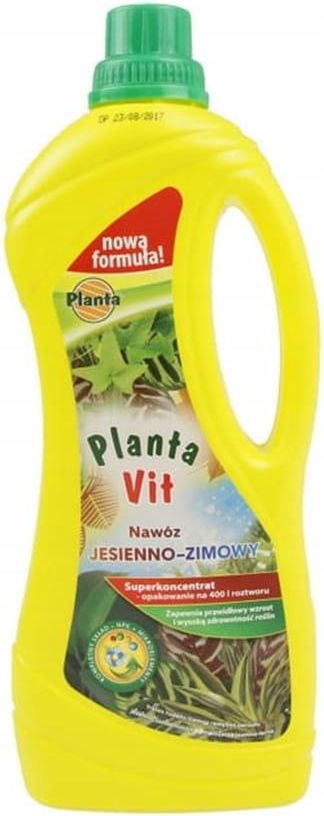 NAWÓZ PLANTA VIT-7 DO ROŚLIN JESIENNO - ZIMOWYCH 1L NAWÓZ PLANTA VIT-7 DO ROŚLIN JESIENNO - ZIMOWYCH 1L PRZEZNACZENIE: do zasilania wszystkich roślin doniczkowych uprawianych w warunkach domowych w okresie jesienno - zimowympodwyższona zawartość fosforu i potasu oraz odpowiednio dobrane mikroelementy gwarantują optymalny rozwój oraz zwiększają zdrowotność roślinSKŁAD: NAWÓZ MINERALNY NPK 3-5-7nawóz WE = spełnia normy Unii EuropejskiejSkładniki:Azot całkowity (N) - 3,2%Fosfor (P) - 4,9%Potas (K) - 7,0%Bor (B) - 0,010%Miedź (Cu) - 0,002%Żelazo (Fe) - 0,020%Mangan (Mn) - 0,010%Molibiden (Mo) - 0,001%Cynk (Zn) - 0,002%DAWKOWANIE: stosować przy każdorazowym podlewaniu doglebowo w dawce 20ml na 6-8l wodydolistnie w dawce 20ml na 12-16l wodynakrętka ma pojemność 40mlprodukt w formie koncentratu = z opakowania 1l uzyskujemy 400l roztwór nawozuKALENDARZ STOSOWANIA: optymalnie: XI-IImożna stosować: X-IIInie stosować: IV-IXOPAKOWANIE: typ opakowania: butelka plastikowapojemność: 1 lmasa nawozu netto: 1,1 kg 5908278968488 023624