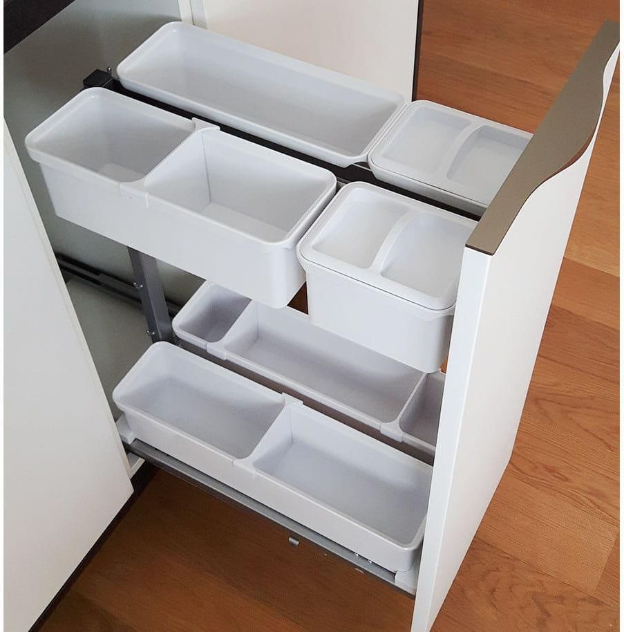Junior YouboXx Set 3+4/ 300 04.8110.KPL/3+4 Kompletny system do szafki podblatowej o szerokości frontu 300 mm. System zawiera 6 pojemników z tworzywa o różnej pojemności, 2 pokrywki, 4 przegródki, komplet prowadnic i mocowanie frontu. System, oprócz tego, że jest ciekawy wizualnie, charakteryzuje się również walorami praktycznymi - przechowywane produkty są łatwo dostępne i przejrzyste, a różnorodność pojemników sprawia, że można w nich przechowywać zarówno drobne przybory kuchenne, jak i niezbędne produkty. Wymiary: Wysokość w świetle: 615 mm Szerokość szafki: 300 mm Minimalna głębokość w świetle: 480 mm Obciążenie całego systemu: 24 kg PEKA Szwajcarska firma już od ponad 50 lat dostarcza innowacyjne rozwiązania do mebli kuchennych i nie tylko. Wiele rozwiązań opatentowała, ma liczne certyfikaty potwierdzające niezawodność. Utrzymuje najwyższy standard jakości, np. druty używane do wyrobu wyciągów, czy magic-cornerów, mają w stosunku do innych producentów, przynajmniej jedną powłokę galwaniczną więcej, a prowadnice używane w cargo podblatowym - firmy SCHOCK - to najwyższa światowa półka i dedykowane są specjalnie do wyciągów PEKI. Peka to również firma nowatorska – jako jedni z pierwszych wprowadzili np. w swoich cargach pełne dno – nazwane u nich ARENA, pierwsi wprowadzili wyciągi ze specjalnie profilowanej blachy – SNELLO i EXTENDO, nikt nie ma jeszcze odpowiednika CONVOYa – kompletnie innowacyjnego wyciągu wysokiego.