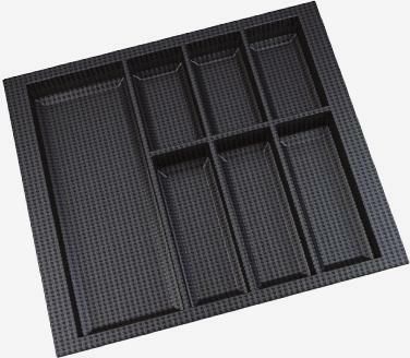 Peka 07.6014.CL - Wkład CLASSICO-Kristall 600/ wymiar 540 x 490/ czarny 5901554243859 Wkład CLASSICO-Kristall 600/ wymiar 540 x 490/ czarny wkład na sztućce Wkład na sztućce Classico-Kristall w kolorze czarnym, to funkcjonalny element do segregacji sztućców i kuchennych akcesoriów. Wymiary wkładu: szerokość: 540 mm, długość: 490 mm, wysokość: 53 mm. Wkład ma po szerokości i po długości szerszy zapas, który umożliwia samodzielne docięcie wkładu do niestandardowych wymiarów szafki z szufladami. Wkład do szuflady wykonany jest z bardzo dobrego jakościowo, wytrzymałego tworzywa sztucznego, bezzapachowego, o grubości 2 mm. Solidny, odporny na odkształcenia i pęknięcia, jest bardzo lekki. Jest łatwy do czyszczenia, gładka powierzchnia wkładu nie „przyjmuje brudu”, nie widać na niej smug czy zarysowań. Jest bardzo estetycznie wykonany i bardzo ładnie wygląda w każdej szufladzie nie tylko w nowoczesnych meblach ale również w szufladach bardziej tradycyjnych. Praktyczny wkład do szuflady pozwoli na utrzymanie porządku i szybkie odłożenie umytych sztućców na właściwe miejsce. Przy podanej szerokości do dyspozycji mam 7 komór. Trzy mniejsze komory posłużą do przechowywania łyżeczek, widelczyków czy innych drobnych akcesoriów np.: zaparzacza do herbaty, trzy większe komory świetnie zorganizują przestrzeń na łyżki stołowe, noże i widelce, natomiast największa szeroka komora idealna będzie do dużych łyżek do mieszania potraw, szczypców, łopatek czy chochli. Wymiary wkładu: szerokość: 540 mm (można go dociąć do wymiaru 490 mm - po około 25 mm z każdej strony), długość: 490 mm (można go dociąć do wymiaru 455 mm - po około 18 mm z każdej strony), wysokość: 53 mm. Wymiary komór (komory posiadają kształt zbliżony do trapezu): 1x komora największa 430x160 mm (wymiar u góry komory), 400x130 mm (wymiar na dnie komory), 3x komory średnie 250x90 mm (wymiar u góry komory), 220x65 mm (wymiar na dnie komory), 3x komory najmniejsze 170x90 mm (wymiar u góry komory), 145x65 mm (wymiar na dnie komory). Uwaga: nie świadczymy usług w zakresie docinania wkładu. W razie potrzeby wkład można przycinać samodzielnie nożykiem tapicerskim lub na maszynie solarskiej. Sposób docięcia wkładu: wkład układamy płaską stroną na równiej i twardej powierzchni, w odpowiednim miejscu przykładamy długą linijkę i przy pomocy ostrego nożyka przerysujemy kilka razy w tym samym miejscu, następnie załamujemy odciętą krawędź. Rozmieszczenie i ilość przegródek jakie faktycznie posiada wkład przedstawia zdjęcie samego produktu, zdjęcia aranżacyjne są poglądowe. Parametry techniczne Wykończenie Kolor czarny Wymiary Wysokość 53 mm Szerokość 540 mm Głębokość 490 mm 07.6014.CL