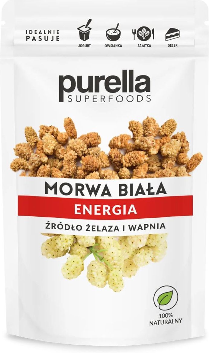 Purella Superfoods, Morwa biała, suszone owoce – naturalnie słodka i smaczna przekąska, idealna jako dodatek do jogurtu, owsianki, sałatek czy deserów. Dzięki swojej delikatnej słodyczy doskonale sprawdzają się również do przygotowania domowych dżemów i marmolad.