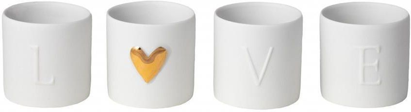 Komplet 4 świeczników na tealighty. Wykonane z porcelany nieszkliwionej, z literkami, układającymi się w napis "love", gdzie rolę "o" pełni złote serduszko. Piękne i stylowe dodatki, które dodadzą uroku i romantycznego klimatu do każdego wnętrza. Idealne na wieczór we dwoje czy relaksujący wieczór w towarzystwie przyjaciół. Wspaniały pomysł na prezent dla bliskiej osoby lub doskonałe uzupełnienie własnej kolekcji dekoracyjnych świeczników. Wykonane z wysokiej jakości porcelany, która zapewnia elegancję. Oferując nastrojowe światło i niepowtarzalny design, te świeczniki stanowią wyjątkowy element dekoracyjny każdego pomieszczenia. Idealne do salonu, sypialni, czy jadalni, podkreślając przy tym wyjątkowość chwili.