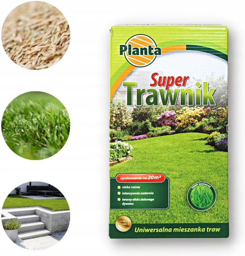 SUPER TRAWNIK 0.5 kg - nasiona, trawa uniwersalna SUPER TRAWNIK 0.5 KGTrawa uniwersalna idealna do warunków przydomowych! Mieszanka traw gazonowych rekomendowana dla przydomowych trawników oraz dla terenów rekreacyjnych. Uniwersalna kompozycja niskich traw renomowanego, krajowego producenta PLANTA, która, oprócz podstawowej pielęgnacji, nie wymaga dużych nakładów pracy. Przygotowana została z wyselekcjonowanych gatunków traw doskonale rozwijających się w warunkach polskiego klimatu. Dzięki przemyślanemu doborowi niskich traw, po właściwemu założeniu trawnika, otrzymujemy efekt gęstej, zwartej, zdrowej i soczyście zielonej darni. Dzięki swoim funkcjonalnym właściwościom i szerokiemu spektrum zastosowania, mieszanka SUPER TRAWNIK od wielu lat cieszy się niesłabnącym uznaniem użytkowników. Informacje o produkcie: trawa SUPER TRAWNIK 0.5 kg Przeznaczenie: przydomowe trawniki, tereny rekreacyjne, ogródki działkowe Opakowanie: pudełko tekturowe 0.5 kg Wydajność: 20 m2 Nisko rośnie Szybko regeneruje się Intensywnie zadarnia Charakteryzuje się znaczną odpornością na choroby Dobrze znosi okresy suszy i udeptywanie Nie wymaga częstego koszenia i podlewania Skład mieszanki: trawa SUPER TRAWNIK 0.5 kg Życica trwała (Lolium perenne): 75% Kostrzewa czerwona (Festuca rubra): 5% Kost. szczeciniasta (Festuca trachyphylla): 5% Kost. trzcinowa (Festuca arundinacea): 15% Rzeczywisty skład mieszanki może nieznacznie różnić się od podanego powyżej ze względu na różnice w numerach partii, co nie wpływa na obniżenie jakości produktu. Jak przygotować trawnik? Usuń starą darń, chwasty i kamienie, wyrównaj powierzchnię; Rozsiej ok. 3kg/100 m² nawozu do trawników (rekomendacja: rozrzuć do 200 l/100 m² torfu); Nawóz razem z torfem wymieszaj z glebą na głębokości ok 5-8 cm, Nasiona wysiej w proporcji 2,5-3kg/100 m² powierzchni. Zastosuj siew krzyżowy: połowę nasion wysiej wzdłuż, a drugą połowę w poprzek terenu. Wymieszaj nasiona z glebą za pomocą grabi na głębokość ok. 1-2 cm. Do wykiełkowania roślin utrzymuj zwilżoną glebę. Pierwsze koszenie wykonaj, gdy trawa osiągnie ok. 10 cm wysokości. Regularnie koś i pielęgnuj trawnik, podlewaj w godzinach wczesno porannych. Jak przygotować teren, jaką wybrać mieszankę i kiedy założyć trawnik?Wszystkiego dowiesz się z filmu przygotowanego przez producenta: Zakładanie trawnika [KLIKNIJ TUTAJ] >>> waga: 0.5 kg skład: Życica trwała (Lolium perenne): 75% Kostrzewa czerwona (Festuca rubra): 5% Kost. szczeciniasta (Festuca trachyphylla): 5% Kost. trzcinowa (Festuca arundinacea): 15% Rzeczywisty skład mieszanki może nieznacznie różnić się od podanego powyżej ze względu na różnice w numerach partii, co nie wpływa na obniżenie jakości produktu. wydajność: 20 producent: Planta