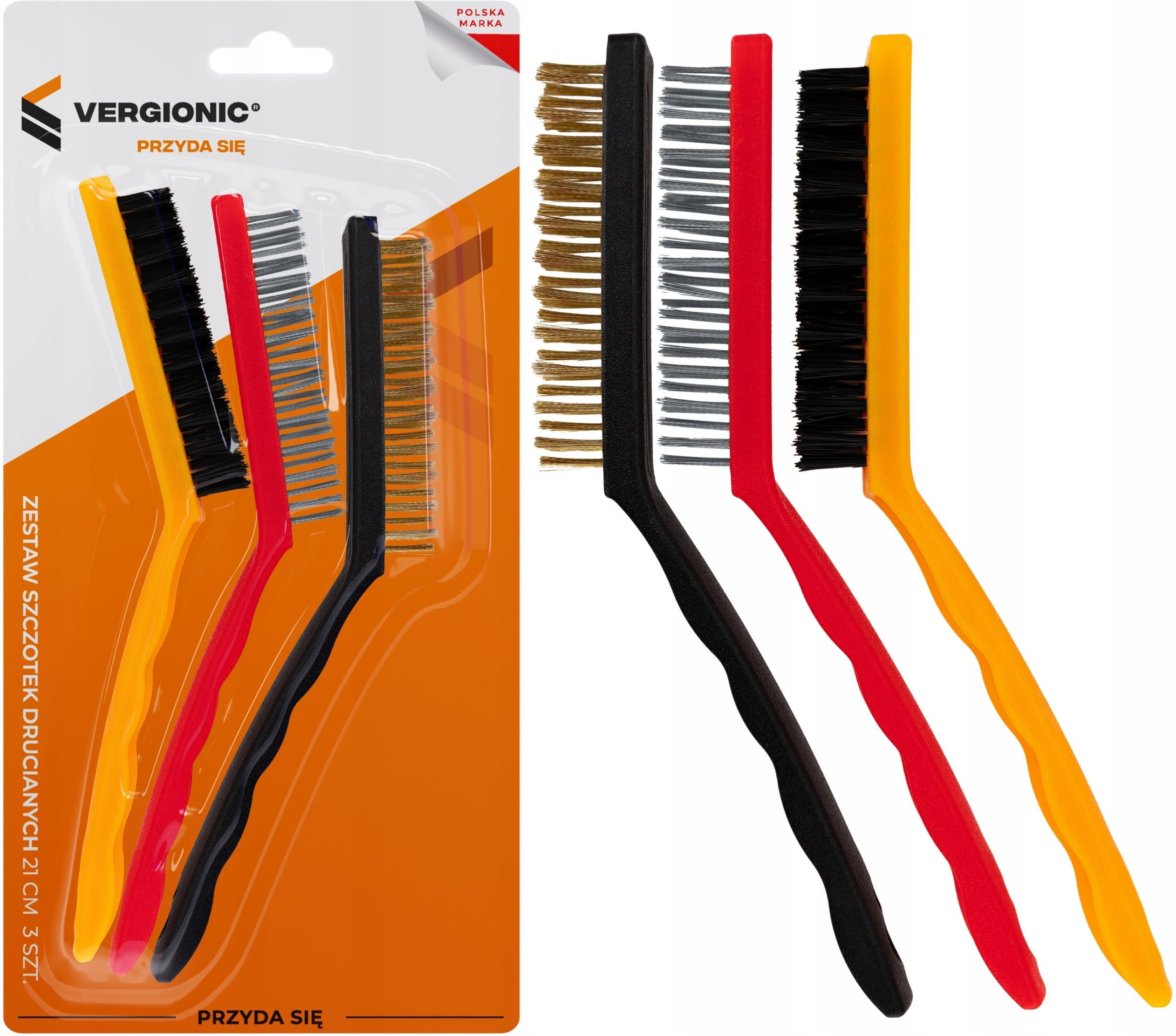 Zestaw szczotek 21 cm 3 szt. mix VERGIONIC Towar zapakowane fabrycznie przez producenta. W skład zestawu wchodzi Szczotka mosiężna (z czarną rękojeścią) Szczotka nylonowa (z żółtą rękojeścią) Szczotka żelazna (z czerwoną rękojeścią) Specyfikacja W zestawie: 3 szt. Rodzaj włosia: miedź, żelazo, …