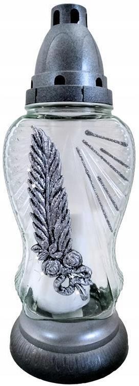 Znicz szklany, srebrny z wkładem Szklany znicz ze srebrną plastikową podstawką i pokrywką, dzięki której płomień nie zgaśnie. Lampion ma zdobienie w kształcie gałązki, która jest przyprószona brokatem. Wysokość znicza to 30 cm.