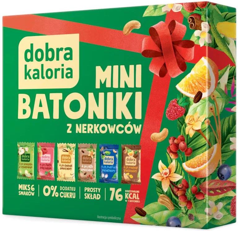 Składniki (mini batoniki z nerkowców z jagodami): orzechy nerkowca (34 %), rodzynki (28 %), pasta daktylowa, orzechy nerkowca prażone (5 %), chrupki komosowe (komosa ryżowa, błonnik z cykorii), jagody czarne liofilizowane (1 %), naturalny aromat. Tylko 73 kcal w batoniku. Składniki (mini batoniki z nerkowców z wanilią): orzechy nerkowca (40 %), rodzynki (27 %), pasta daktylowa, orzechy nerkowca prażone (5 %), mielona ekstrahowana laska wanilii (0,5 %), naturalny aromat. Tylko 76 kcal w batoniku. Składniki (mini batoniki owocowo-orzechowe a`la tarta malinowa): Składniki: orzechy nerkowca (39%; orzechy, mączka, miazga), rodzynki (28%), daktyle suszone, chrupki komosowe (mąka z komosy ryżowej, błonnik z cykorii, sok z buraka w proszku), malina liofilizowana (1%), naturalny aromat. Składniki (mini batoniki a la piernik korzenny): orzechy nerkowca (34 %), rodzynki, pasta daktylowa, orzechy nerkowca prażone (5 %), chrupki komosowe (komosa ryżowa, błonnik z cykorii), przyprawa do piernika (1 % [cynamon, imbir, skórka pomarańczy, anyż owoc, goździki, gałka muszkatołowa, kardamon, ziele angielskie]). Składniki (mini batoniki a`la szarlotka z rodzynkami): orzechy nerkowca (28 %), rodzynki, pasta daktylowa, jabłka suszone (10 %) (zawierają siarczyny), orzechy nerkowca prażone (10 %), chrupki komosowe (mąka z komosy ryżowej, błonnik z cykorii, zagęszczony sok jabłkowy), cynamon (0,6 %). Składniki (mini batoniki a`la latte waniliowe): Składniki: orzechy nerkowca (33 %), rodzynki, pasta daktylowa, orzechy nerkowca prażone (5 %), chrupki komosowe (komosa ryżowa, błonnik z cykorii), kawa mielona (2 %), mielona ekstrahowana laska wanilii (0,5 %), naturalny aromat. Mini batoniki z nerkowców mix 6 smaków Dobra Kaloria W 100% naturalne mini batoniki z orzechami nerkowca w estetycznym pudełeczku mix sześciu smaków w wydaniu bardziej "prezentowym / upominkowym" (pudełeczko z narysowaną wstążką). To zdrowa przekąska bez dodanego cukru (zawiera tylko naturalnie występujące w składnikach cukry), świetna gdy mamy ochotę przekąsić coś słodkiego, lub szukamy pomysłu na drobny upominek lub dodatek do prezentu. W pudełeczku znajduje się 6 mini batoników w sześciu smakach: * A la Muffin Jagodowy * A la Sernik Waniliowy * A`la Tarta Malinowa * A`la Piernik Korzenny * A`la Szarlotka z Rodzynkami * A`la Latte Waniliowe Dostępne są również inne smaki z tej serii mini batoników / pojedyncze smaki tych przekąsek. Świetnie sprawdzą się do lunchboxa, na deser, do kawy. Wysoka zawartość błonnika, magnezu i potasu. Batony są odpowiednie dla wegetarian i wegan, zawierają również sporo białka roślinnego. W opakowaniu znajduje się 6 batoników. Wartość odżywcza w 100 g (a`la tarta malinowa): Wartość energetyczna: 1700 kJ / 406 kcal Tłuszcz: 16 g w tym kwasy tłuszczowe nasycone: 2,6 g Węglowodany: 53 g w tym cukry: 46 g Błonnik: 6,4 g Białko: 8,9 g Sól: 0,02 g Magnez: 142 mg (38% RWS) Potas: 672 mg (34% RWS) RWS - referencyjna wartość spożycia Wartość odżywcza w 100 g (a`la sernik waniliowy): Wartość energetyczna: 1867 kJ / 447 kcal Tłuszcz: 23 g w tym kwasy tłuszczowe nasycone: 3,8 g Węglowodany: 48 g w tym cukry: 41 g Błonnik: 4,9 g Białko: 9,3 g Sól: 0,02 g Magnez: 154 mg (41% RWS) Potas: 680 mg (34% RWS) RWS - referencyjna wartość spożycia Wartość odżywcza w 100 g (a`la muffin jagodowy: Wartość energetyczna: 1787 kJ / 427 kcal Tłuszcz: 18 g w tym kwasy tłuszczowe nasycone: 3,4 g Węglowodany: 55 g w tym cukry: 38 g Błonnik: 4,8 g Białko: 7,9 g Sól: 0,03 g Magnez: 140 mg (37% RWS) Potas: 675 mg (34% RWS) RWS - referencyjna wartość spożycia Wartość odżywcza w 100g (mini batoniki a`la piernik korzenny): Wartość energetyczna: 1790 kJ / 428 kcal Tłuszcz: 20 g w tym kwasy tłuszczowe nasycone: 3,2 g Węglowodany: 50 g w tym cukry: 42 g Błonnik: 5,9 g Białko: 10 g Sól: 0,06 g Magnez: 133 mg (35% RWS) Potas: 826 mg (41% RWS) RWS - referencyjna wartość spożycia Wartość odżywcza w 100g (a`la szarlotka): Wartość energetyczna: 1760 kJ / 420 kcal Tłuszcz: 18 g w tym kwasy tłuszczowe nasycone: 3,4 g Węglowodany: 54 g w tym cukry: 37 g Błonnik: 5,3 g Białko: 7,7 g Sól: 0,03 g Magnez: 136 mg (36% RWS) Potas: 660 mg (33% RWS) RWS - referencyjna wartość spożycia Wartość odżywcza w 100g (a`la latte waniliowe): Wartość energetyczna: 1746 kJ / 417 kcal Tłuszcz: 19 g w tym kwasy tłuszczowe nasycone: 3,3 g Węglowodany: 47 g w tym cukry: 42 g Błonnik: 8,8 g Białko: 10 g Sól: 0,03 g Magnez: 145 mg (39% RWS) Potas: 660 mg (33% RWS) RWS - referencyjna wartość spożycia