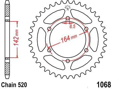 Dane techniczne: - Rozmiar: 520 - Średnica wewn.: 142 mm - Średnica osadzenia śrub mocujących: 164 mm - Średnica otworu: 8.5 mm - Liczba śrub mocujących: 6 - Typ otworu mocującego: Płaski - Ilość zębów: 46 - Typ / materiał zębatki tylnej: Stal - Producent: JT Ten produkt pasuje do modeli: Hyosung - …
