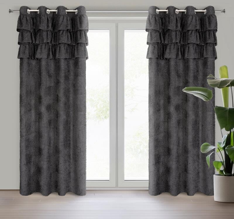 Zasłona zaciemniająca na przelotkach marki Eurofirany – styl i komfort w Twoim domu Zasłona zaciemniająca na przelotkach marki Eurofirany to idealne rozwiązanie dla osób, które pragną stworzyć w swoim wnętrzu komfortowe warunki snu i wypoczynku, jednocześnie dodając elegancji swoim oknom. Wykonana z wysokiej jakości materiału, zasłona zapewnia doskonałe zaciemnienie, blokując dostęp światła zewnętrznego i dbając o prywatność. Dzięki praktycznym przelotkom, zasłona jest łatwa w montażu i bezproblemowo przesuwa się po karniszu. Produkt marki Eurofirany dostępny jest w szerokiej gamie kolorów i rozmiarów, co pozwala na idealne dopasowanie do każdego wnętrza, zarówno nowoczesnego, jak i klasycznego. Materiał jest odporny na zagniecenia i łatwy w pielęgnacji, co sprawia, że zasłona wygląda stylowo przez długi czas. Cechy produktu: Wysokiej jakości tkanina zaciemniająca marki Eurofirany, Praktyczne przelotki umożliwiające szybki montaż i wygodne przesuwanie zasłon, Doskonała ochrona przed światłem słonecznym – idealna do sypialni, salonu czy biura, Ochrona prywatności i lepsza izolacja termiczna, Zasłona zaciemniająca na przelotkach marki Eurofirany to wybór, który łączy w sobie funkcjonalność i nowoczesny design, zapewniając stylową aranżację okien oraz pełen komfort w Twoim domu. Zasłona gotowa z tkaniny moherowej z falbanami szerokość: 140 cm, długość: 250 cm, kolor: czarny, Gramatura: 110 GSM, Skład: 100% poliester