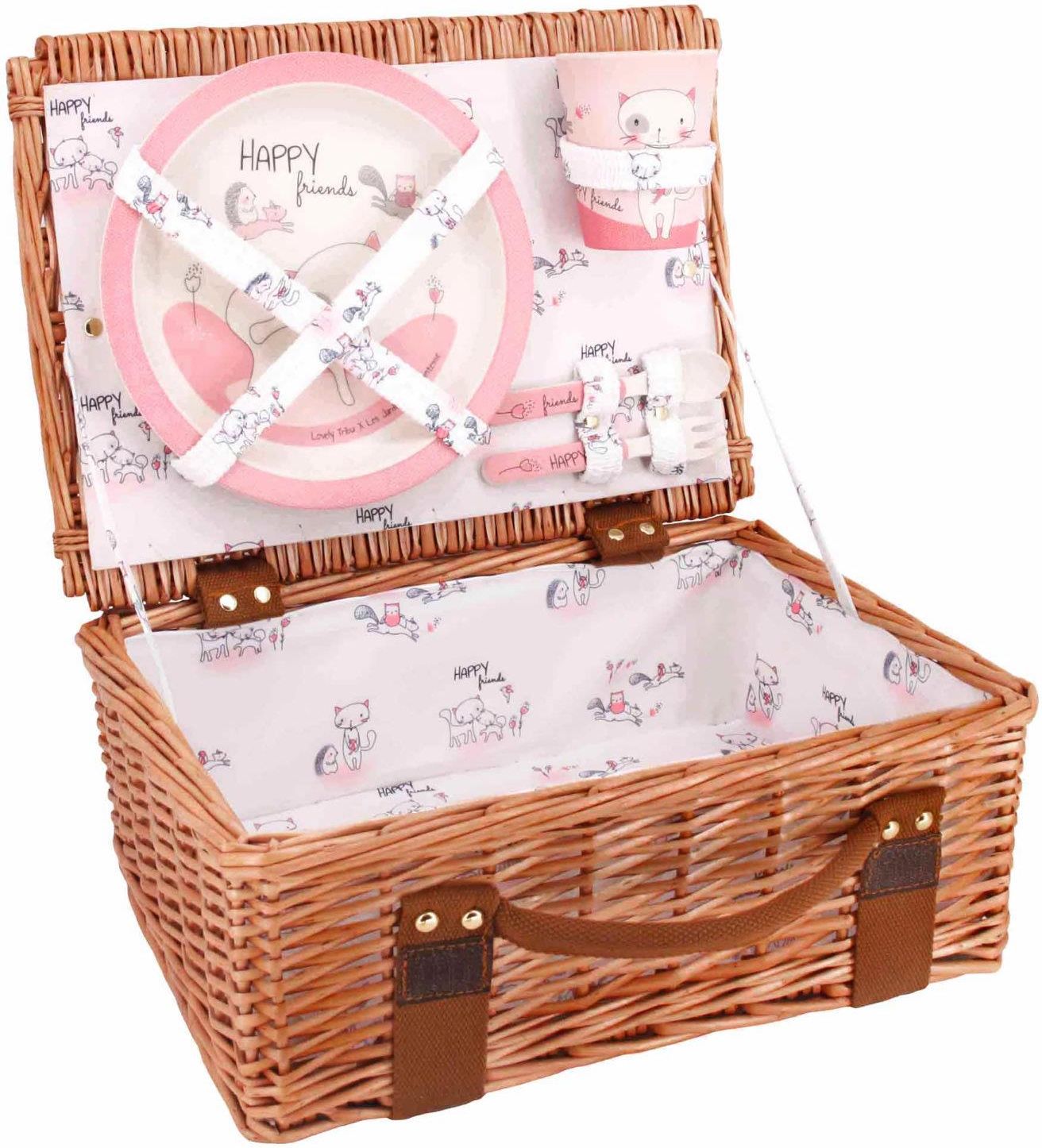Lekki kosz piknikowy dla dzieci Lily le chaton z kolekcji Happy Friends, wykonany ręcznie z naturalnej wikliny. Posiada komplet zastawy z włókna bambusowego.