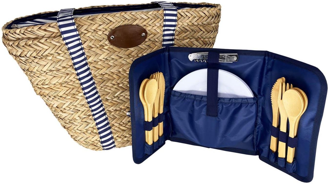 Torba plażowa Riviera z uchwytami w biało-niebieskie paski. Z zewnątrz wykonana z plecionej rafii. Wewnątrz komora izolująca chłód. Posiada niezbędne wyposażenie dla 4 osób.