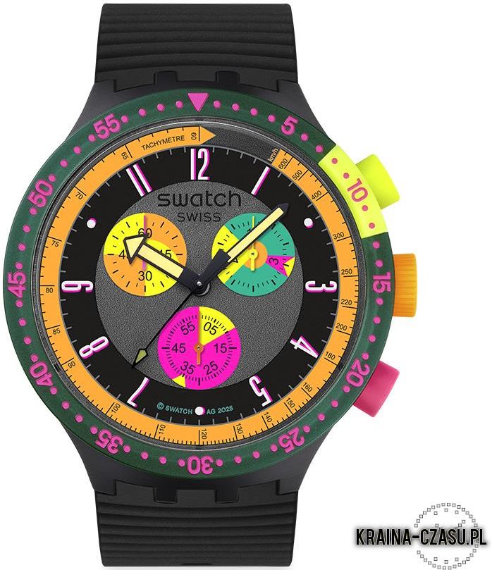 ODKRYJ WIĘCEJ NOWOŚCI SWATCH Odkryj Zegarek SWATCH NEON SEPPIA Zegarek Swatch NEON SEPPIA to wyjątkowa propozycja dla miłośników zegarków fashion, którzy cenią odważny styl i niepowtarzalny charakter. Model ten jest współczesnym remiksem kultowego modelu SEPPIA, unikatowego AQUACHRONO z 1994 roku, teraz odświeżonym w kolekcji BIG BOLD. Duża koperta o średnicy 47 mm i kontrastujące neonowe akcenty w różu, zieleni i żółci sprawiają, że zegarek wyróżnia się z tłumu, przyciągając spojrzenia i dodając stylizacji nowoczesnego charakteru. Tarcza i szkło – funkcjonalność i ochrona Tarcza w wielokolorowym wykończeniu nadaje zegarkowi modowego charakteru, a wyraziste indeksy zapewniają czytelny odczyt. Szkło akrylowe jest lekkie, odporne na pęknięcia, łatwe w renowacji i podkreśla codzienną funkcjonalność zegarka. Mechanizm - trwałość i niezawodność Zegarek wyposażony jest w precyzyjny mechanizm kwarcowy z funkcją chronografu, dzięki czemu sprawdzi się nie tylko jako modny dodatek, ale także praktyczne narzędzie do mierzenia czasu i stopera. To idealne połączenie designu z technologią. Koperta i pasek Czarna, masywna koperta wykonana z wytrzymałego tworzywa sztucznego podkreśla nowoczesny charakter zegarka. Towarzyszy jej ciemny, teksturowany pasek, który zapewnia komfort noszenia i uniwersalny unisexowy styl – odpowiedni zarówno dla kobiet, jak i mężczyzn Postaw na Swatch NEON SEPPIA – zegarek, który łączy modny design z funkcjonalnością. Dodaj go do swojej kolekcji już teraz i wyraź swój indywidualny styl.