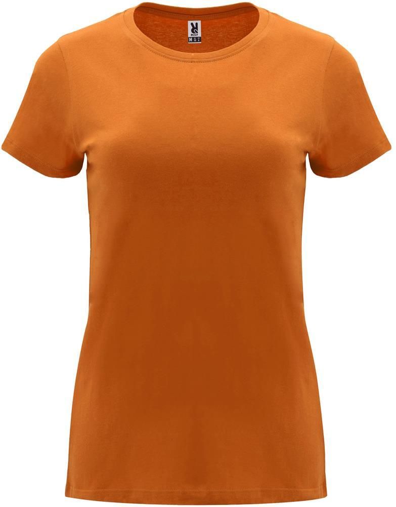 Damska dopasowana koszulka z krótkim rękawem. Okrągły prążkowany dekolt 1x1. Wzmocnione, kryte szwy na kołnierzu. Usuwalna metka.