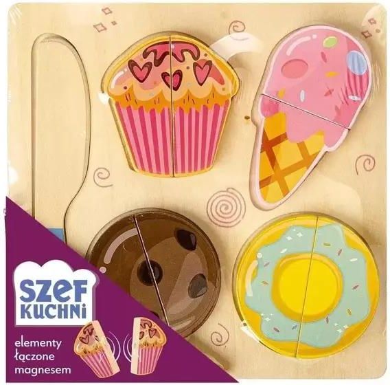 Zestaw kulinarny "Szef kuchni" dla dzieci Zaawansowany zestaw "Szef kuchni" stymuluje wyobraźnię, rozwija kreatywność oraz umiejętności manualne Twojego dziecka. Zestaw ten pozwala na odkrywanie barwnego świata przekąsek, zachęcając dzieci do poznawania sztuki gotowania. Wykonany z drewna, komplet jest pokryty bezpieczną dla dzieci farbą. Poszczególne elementy łączone są za pomocą magnesów. Przekonaj się, jak wiele radości sprawi Twojemu dziecku zabawa tym kreatywnym i inspirującym zestawem kulinarnym. Zachęcaj swoją pociechę do eksperymentowania w kuchni i rozwijania swojego talentu kulinarne! EAN: 5905422041295