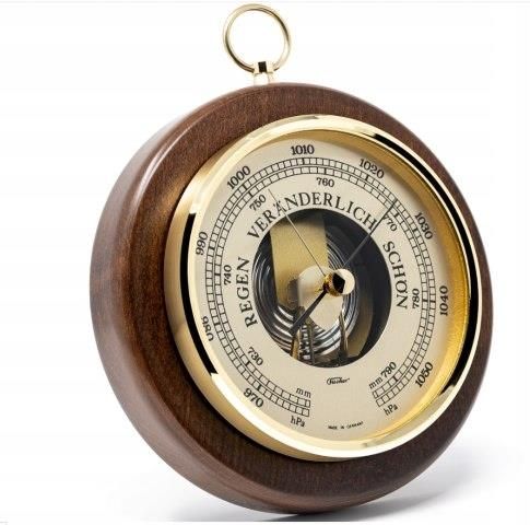 Barometr okrągły 1436R-12 Fischer Wysokiej klasy barometr okrągły 1436R-12 marki Fisher to kombinacja elegancji i wieloletniej tradycji. Marka Fischer z siedzibą w Derbach w Niemczech od blisko 80 lat tworzy światowej klasy instrumenty pomiarowe, takie jak barometry, higrometry, czy termometry. Model 1436R-12 to klasyczny barometr pogodowy z widocznym mechanizmem. Urządzenie osadzone jest w mosiężnej oprawie na drewnianej podstawie w kolorze orzechowym. Beżowa tarcza kontrastuje z czarnymi napisami w języku angielskim. Barometr świetnie wkomponuje się w aranżacje w stylu gabinetowym, angielskim i kolonialnym. Skalowanie barometru przeprowadzone zostało w fabryce. Jednak na skutek np. silnych wstrząsów nowa regulacja może okazać się konieczna. Aby ją przeprowadzić należy użyć śrubokrętu i wyregulować śrubę na tylnej ściance urządzenia zgodnie z zaleceniami załączonej instrukcji. Informacje o produkcie Średnica: 17cm Średnica tarczy instrumentu : 13,5cm Materiał: mosiądz, stal nierdzewna, drewno Urządzenie osadzone w mosiężnej oprawie Drewniana obudowa Kolor drewnianej obudowy – orzech Nazwy na tarczach w języku angielskim Zastosowanie: wewnątrz pomieszczeń Dokładność pomiaru barometru: ± 2 hPa Do czego służy barometr? Barometr to bardzo precyzyjne urządzenie mierzące ciśnienie powietrza. Wykorzystuje w tym celu tzw. puszkę próżniową, której ścianki rozszerzają się lub zwężają o setne milimetra w zależności od zmieniającego się ciśnienia powietrza. Powszechnie wiadomo, że im wyżej nad poziomem morza, tym niższe ciśnienie. Im wyższe ciśnienie, tym coraz mniej zmienna pogoda. Przy ciśnieniu wyższym, niż 1020 mbar możemy oczekiwać suchego, pogodnego dnia. Latem będzie to po prostu ładna pogoda, zimą dzień zapewne mroźny (choć z możliwością wystąpienia mgieł). Ciśnienie w przedziale 1005 – 1020 mbar to pogoda zmienna. Momenty rozjaśnień przeplatać się mogą z przelotnym deszczem. Przy ciśnieniu poniżej 1000 mbar niebo będzie zasnute chmurami i możemy oczekiwać deszczu. Wzrost ciśnienia oznacza poprawę, i odwrotnie, jego spadek to pogorszenie pogody. Letnie, nagłe, wyraźne skoki ciśnienia mogą oznaczać silne burze. EAN: 5902067228319 Model: 228319