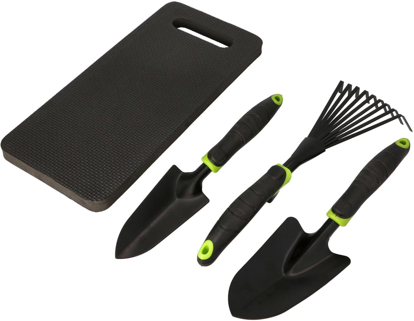 Wykonanie część robocza wykonana ze stali rękojeść wykonana z dwukompozytowego materiału TPR dla zapewnienia komfortowej pracy specjalnie wyprofilowana rękojeść podkładka z materiału EVA Zestaw zawiera łopatka łopatka wąska grabki 9-zębów podkładka pod kolana (410x185mm)