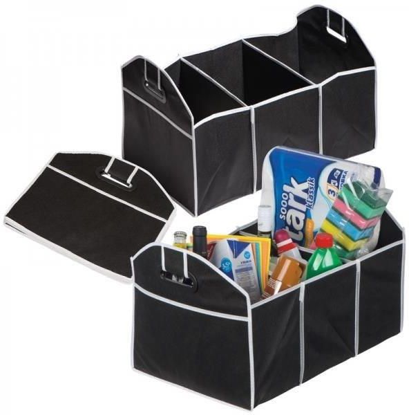 Praktyczna torba do bagażnika z trzema przegródkami wykonana z polestru i non-woven.