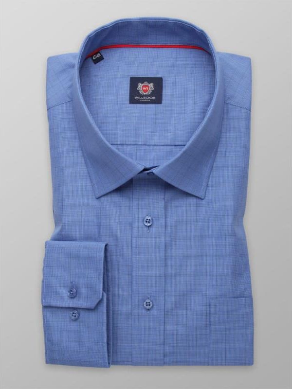 Niebieska klasyczna koszula w drobna pepitkę i granatową kratkę z klasycznym kołnierzykiem, splot two-ply