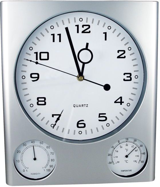 Elegancki zegar ścienny, który fascynuje swoją dyskretną białą tarczą i matowo-srebrną obudową. Poza czasem, wyświetla również wilgotność powietrza i temperaturę. Ozdobi każdą ścianę! Produkt bez baterii (1 bateria AA). Zegar jest zapakowany w pojedynczy kartonik.