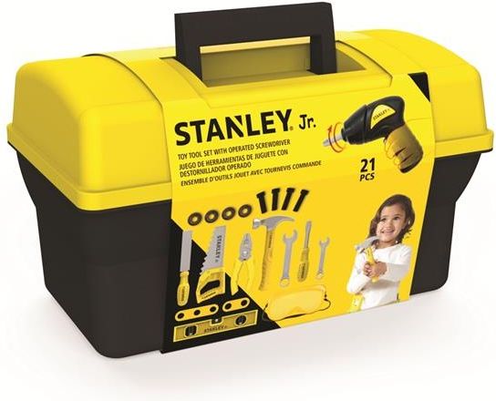 STANLEY STANLEY Skrzynka z narzędziami SRP033-SY 44383 Skrzynka z narzędziami Stanley Jr. to doskonała propozycja dla dzieci, które chcą poczuć się jak prawdziwi majsterkowicze. Zestaw został zaprojektowany tak, by wiernie odwzorowywać wygląd i funkcje narzędzi marki Stanley, jednocześnie pozostając w pełni bezpieczny dla najmłodszych. W zestawie znajduje się 18 elementów, w tym m.in. młotek, piła, śrubokręty, klucze, kombinerki, poziomica, a także praktyczny wkrętak na baterie. Wszystko zamknięte jest w solidnej, żółto-czarnej skrzynce, którą łatwo przenosić i utrzymywać w porządku. Zabawka nie tylko dostarcza wiele godzin angażującej zabawy, ale również rozwija zdolności manualne, uczy logicznego myślenia i zachęca do twórczego rozwiązywania problemów. Dzięki realistycznemu wyglądowi i wysokiej jakości wykonania dzieci mogą naśladować dorosłych, ucząc się podstawowych umiejętności w bezpieczny i przyjemny sposób. To idealny prezent dla małych konstruktorów, którzy chcą odkrywać świat narzędzi i budować swoje pierwsze „projekty” w domowym warsztacie.