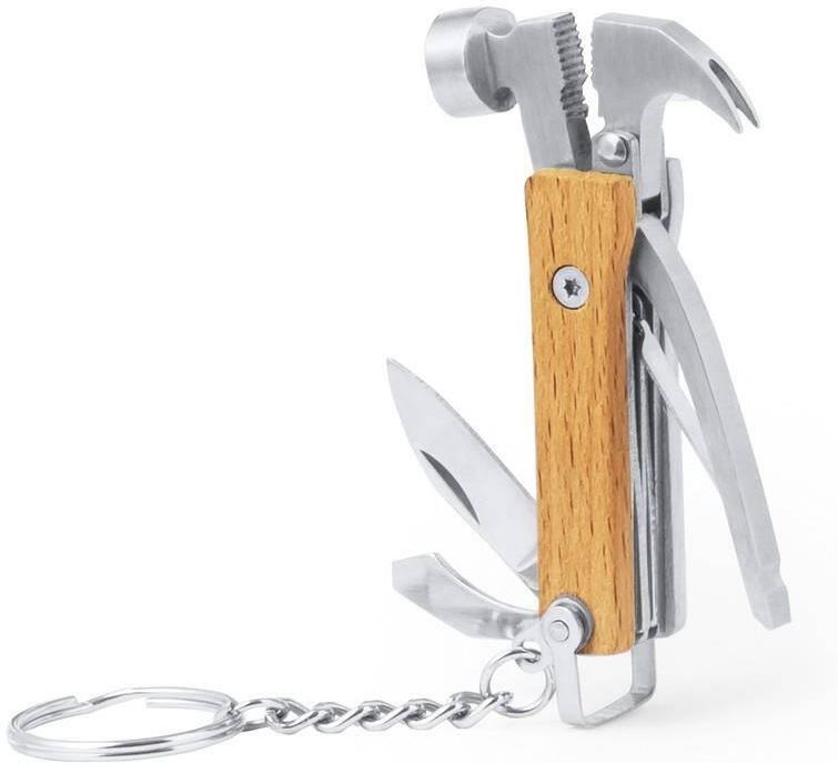 Narzędzie wielofunkcyjne z drewnianym uchwytem, brelok do kluczy, 7 funkcji: młotek, szczypce, mały płaski śrubokręt, nóż, ściągacz izolacji, pilnik i otwieracz do butelek